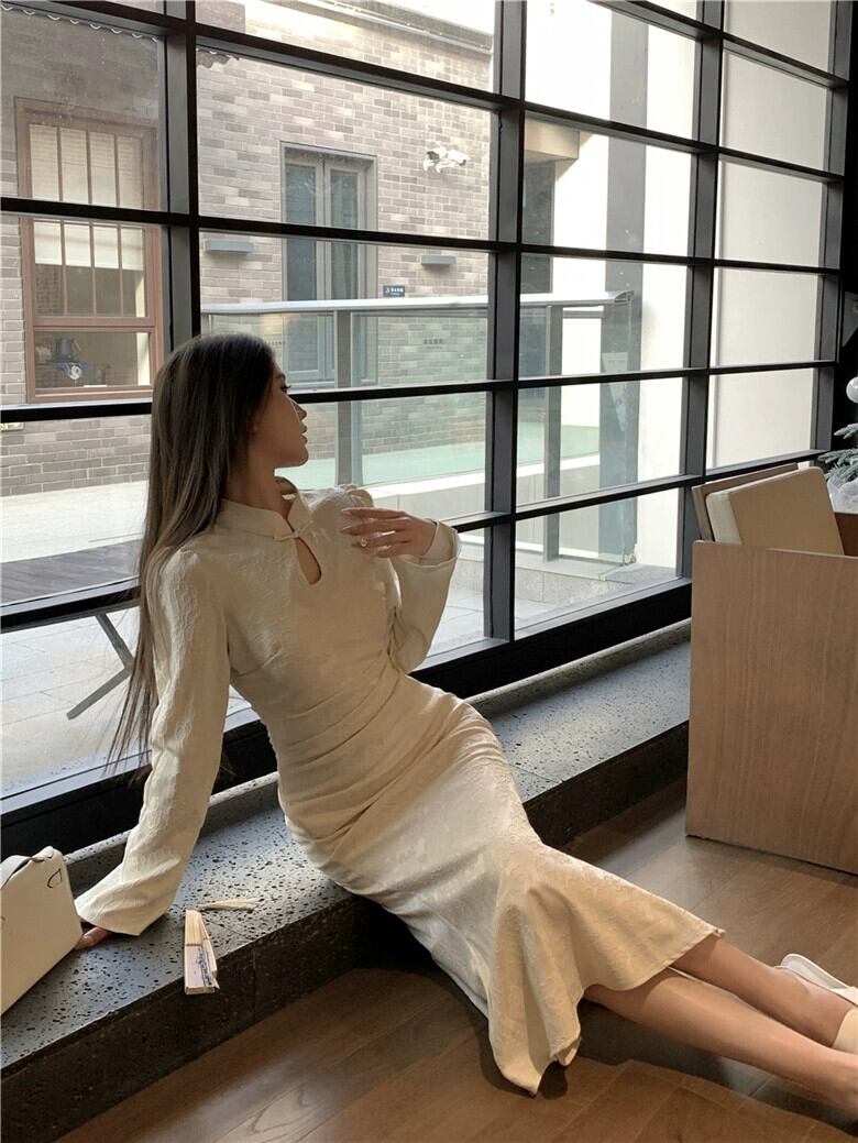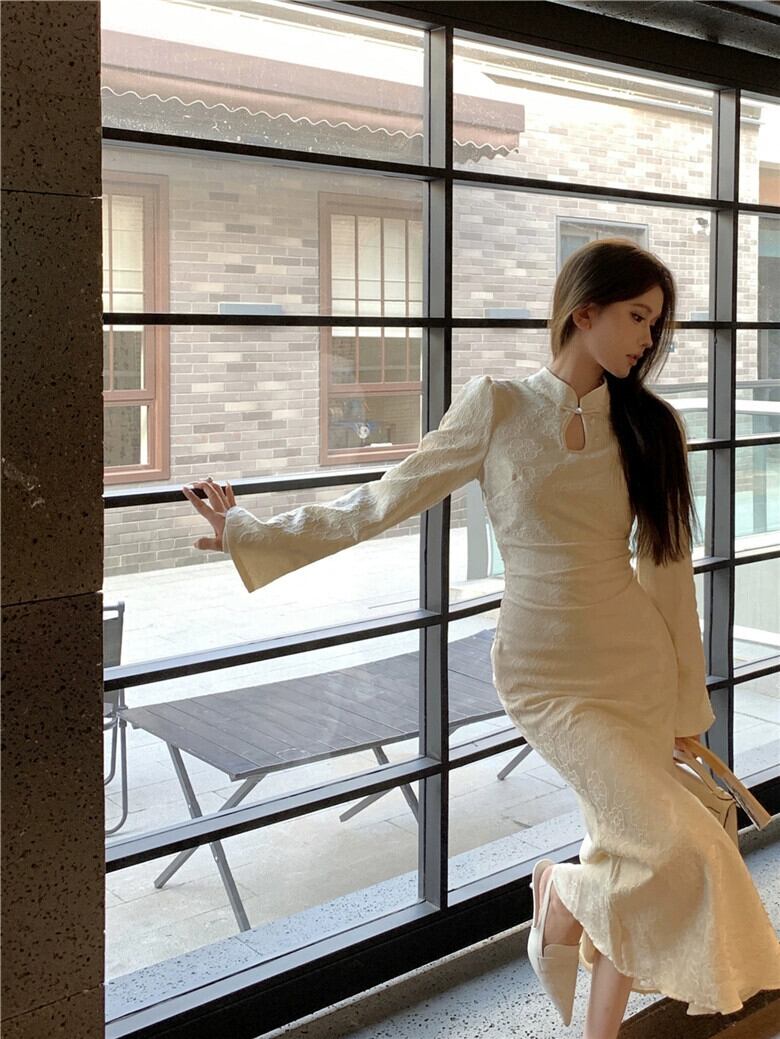 中国風中空ジャカード長袖チャイナドレス女性の春の国民スタイルのウエストを締めるフィッシュテールスカート優しいミドル丈スカート ロング スプリング 春物 bstraw36763097679 | beaute25