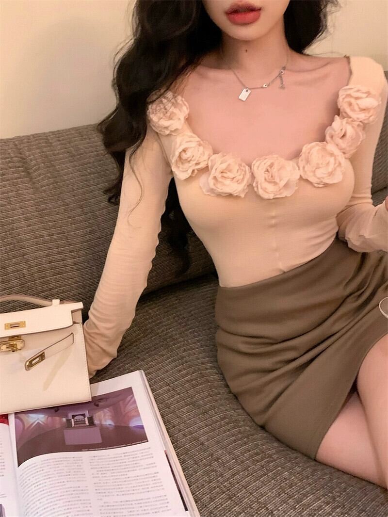 立体フラワー長袖スクエアネックTシャツレディース春フレンチジェントルスタイルスリムフィットショートトップスとボトリングシャツ ロング スプリング 春物 フラワーデザイン スクウェア bstraw99106626143 | beaute25