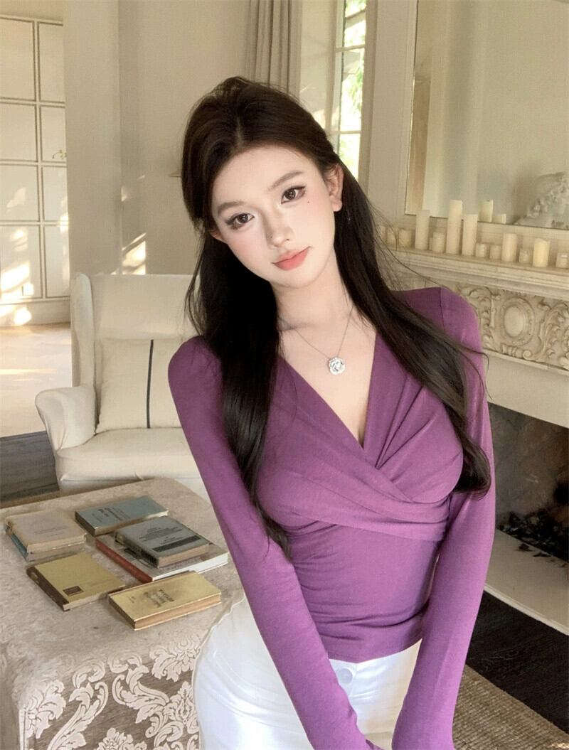 パープルクロス V ネック長袖インナーセーターレディース春ウエスト痩身純粋な欲望スタイルショートボトリングトップ ロング スプリング 春物 Vネック ピュア bstraw50080775675 | beaute25