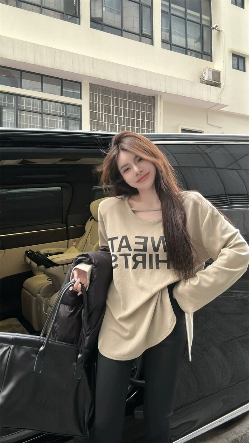 レタープリントの起毛長袖 T シャツ、レディース 春のミドル丈のゆったりとした万能なスリット トップとベース レイヤーの組み合わせ ロング レッド スプリング 春物 Tシャツ bstraw46666597785 | beaute25