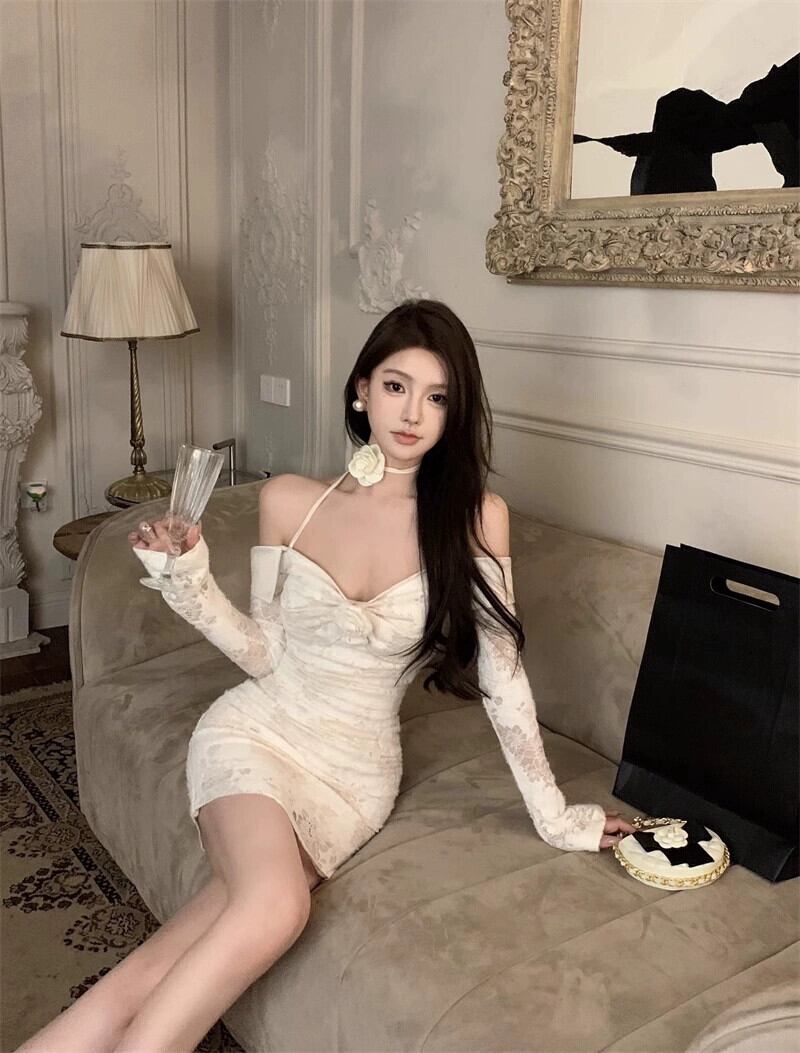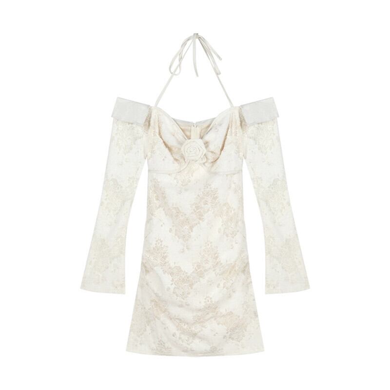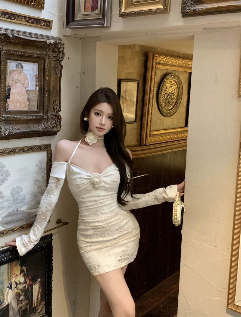 立体花長袖ワンショルダーホルターネックレースドレス女性の春の純粋な欲望スタイルスリムヒップ抱きショートスカート ロング スプリング 春物 ピュア フラワーデザイン bstraw18000603629 | beaute25
