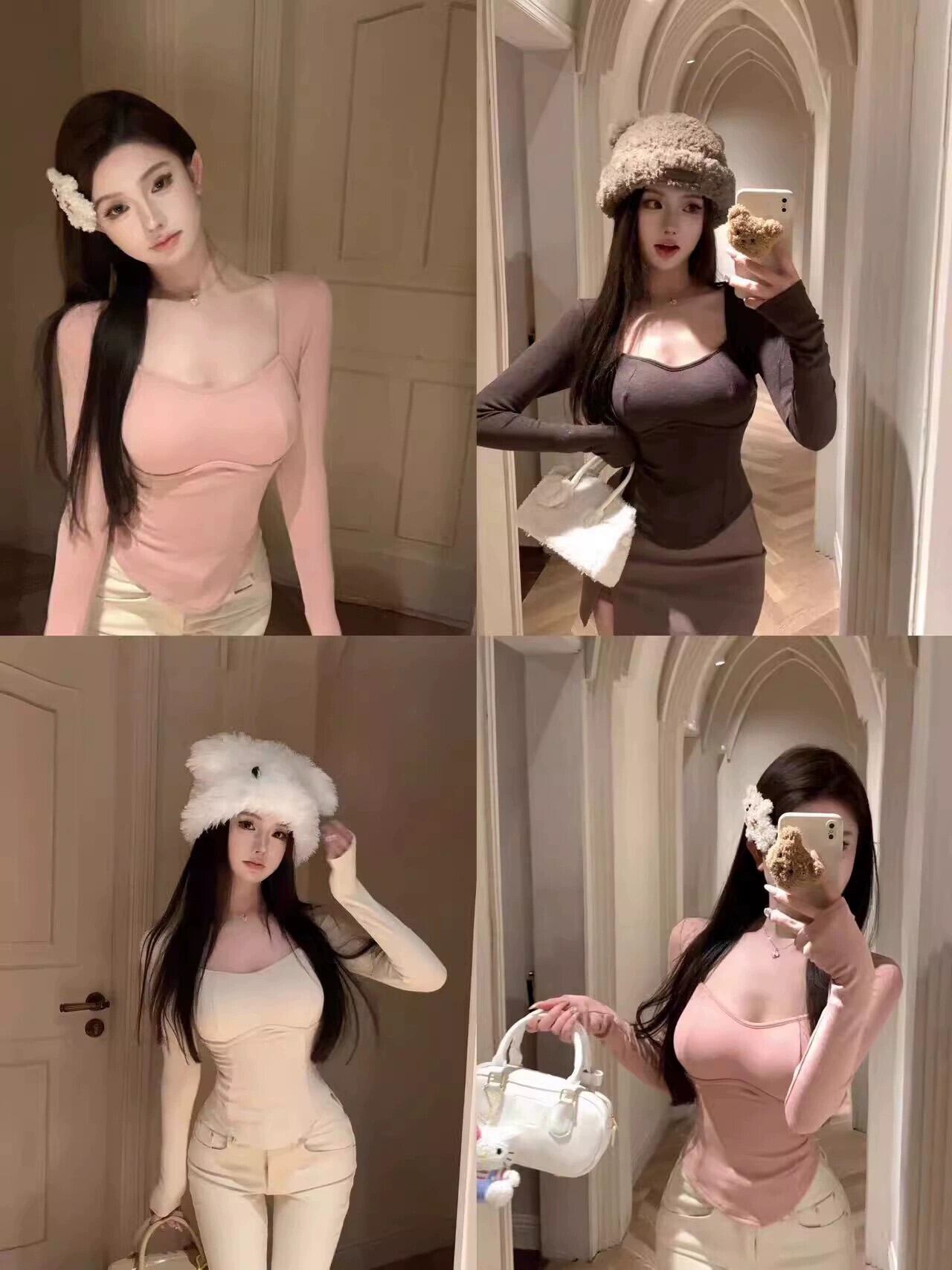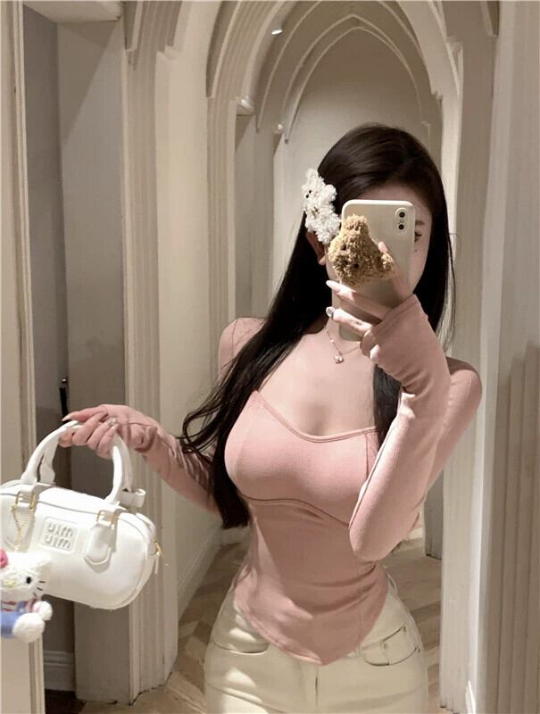 豪華なピンクの長袖スクエアネック T シャツの女性、パッド入りの春のインナー レイヤリング シャツ、優しいスリム フィットのショート トップ ロング スプリング 春物 Tシャツ スクウェア bstraw84232240934 | beaute25