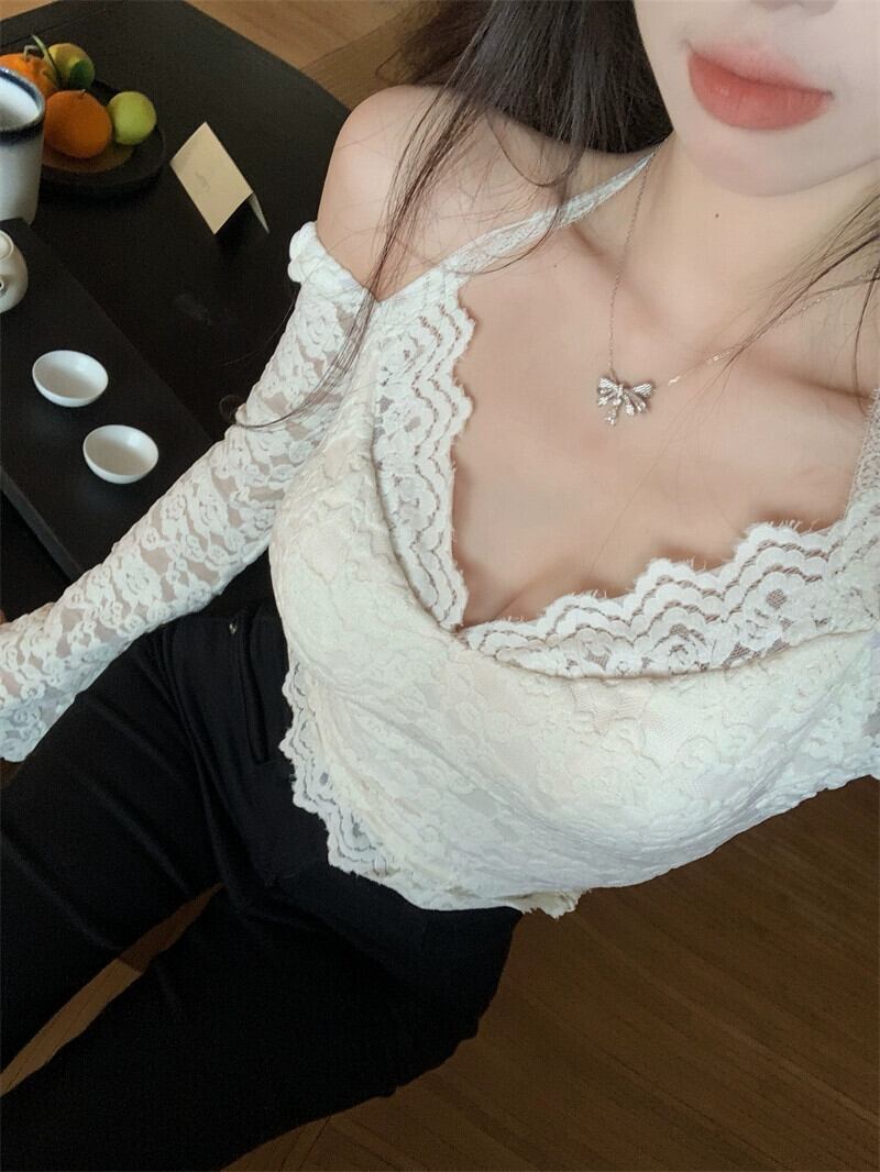 アプリコット長袖ホルターネックレースボトリングシャツ女性春純粋な欲望セクシーなスリムショートオフショルダーインナートップ ロング スプリング 春物 ピュア bstraw27413954849 | beaute25
