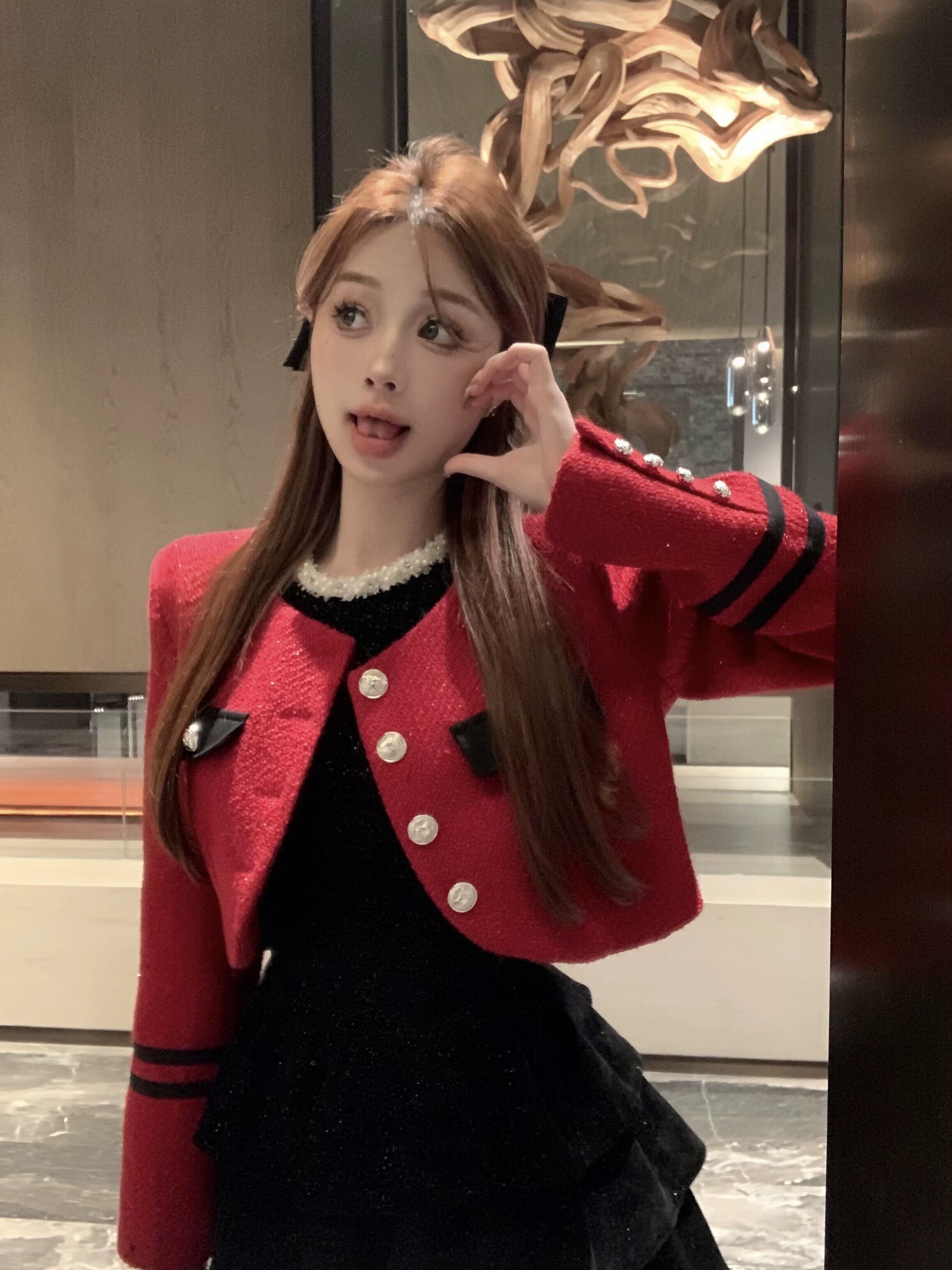 レッドショート長袖ラウンドネックジャケット女性 2024 初春新スタイルルーズ少し香りの良いスタイルセレブ右肩カーディガントップ ロング スプリング 春物 Oネック bstraw35529424477 | beaute25