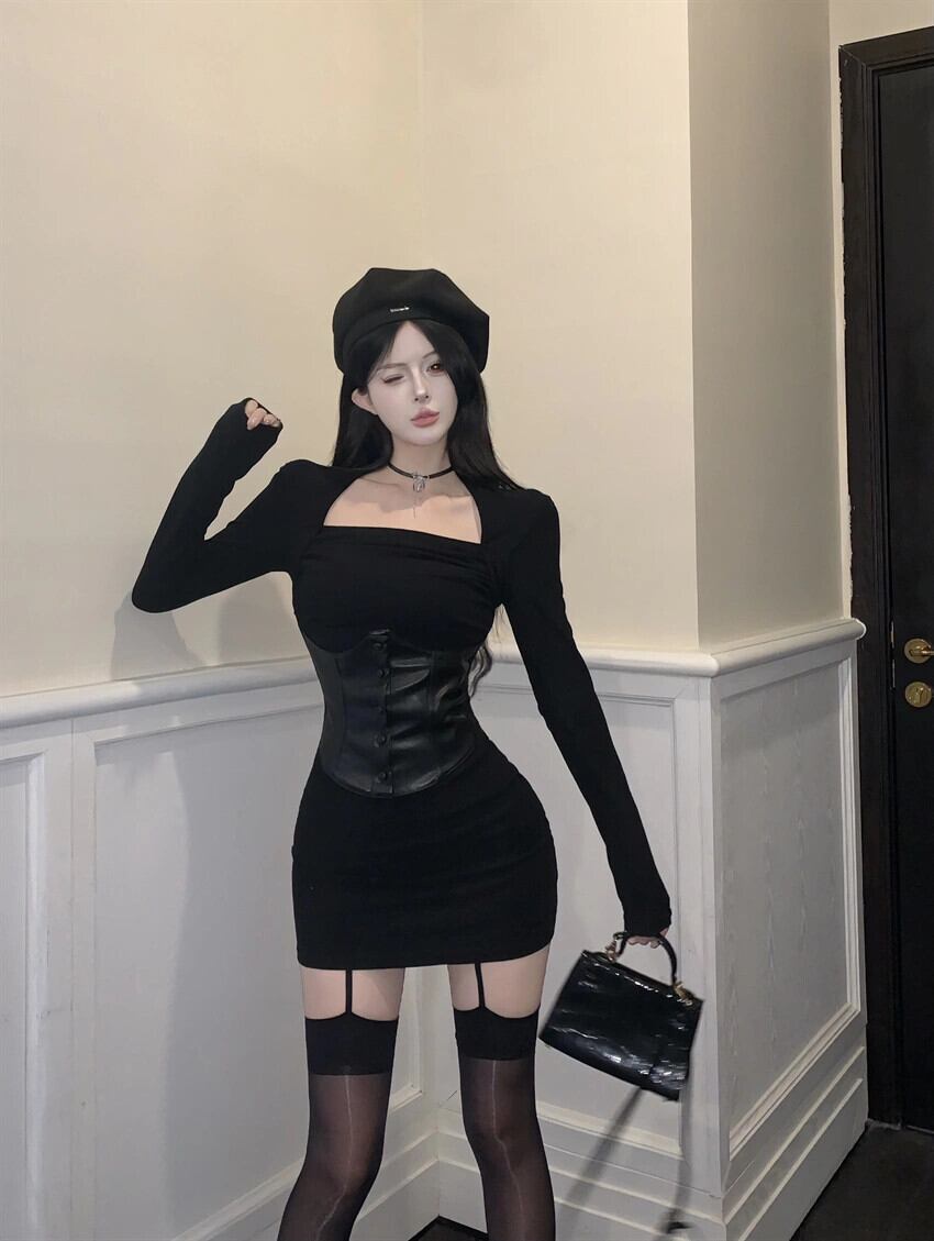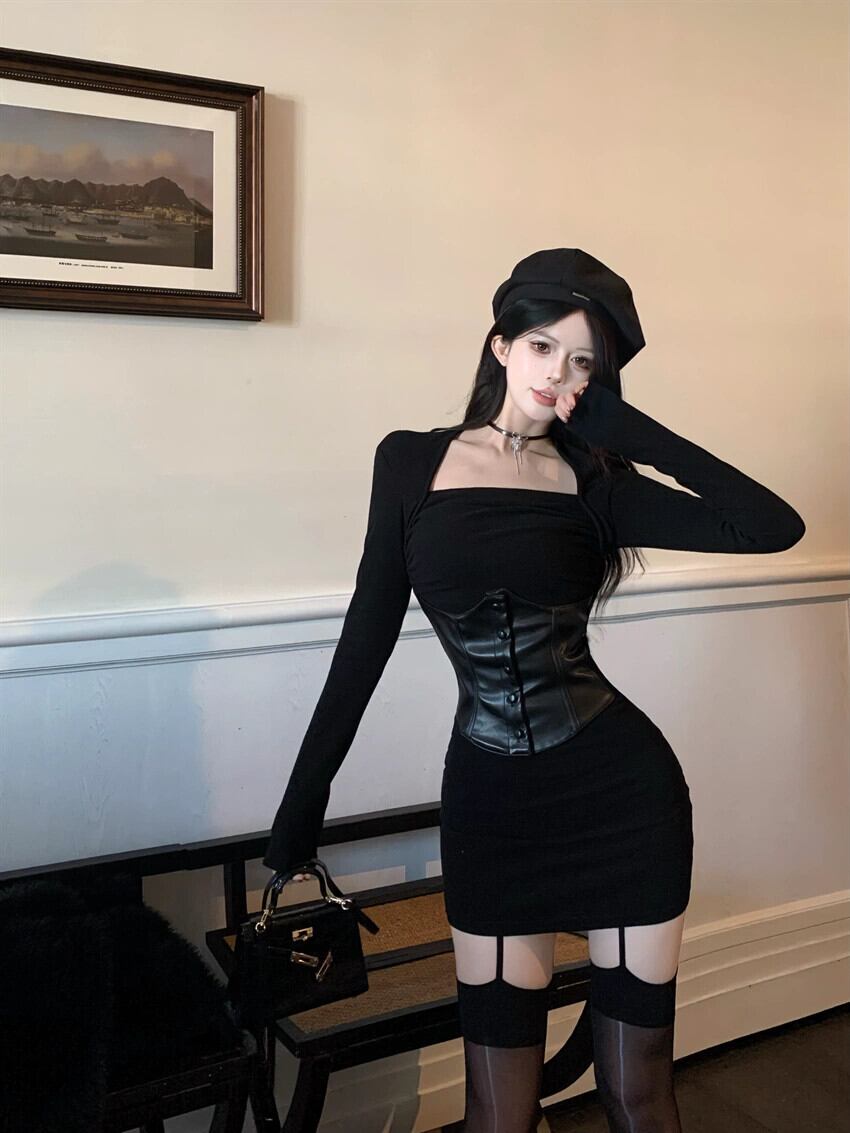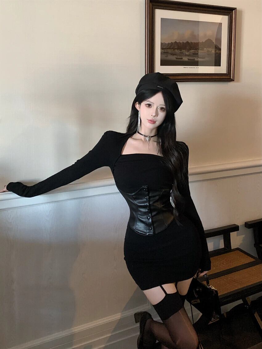 フェイクツーピース pu レザーガードル長袖スクエアネックドレス女性春リトルブラックドレスタイトなヒップハグショートスカート ロング スプリング 春物 スクウェア bstraw86901799964 | beaute25