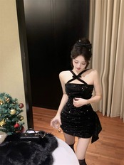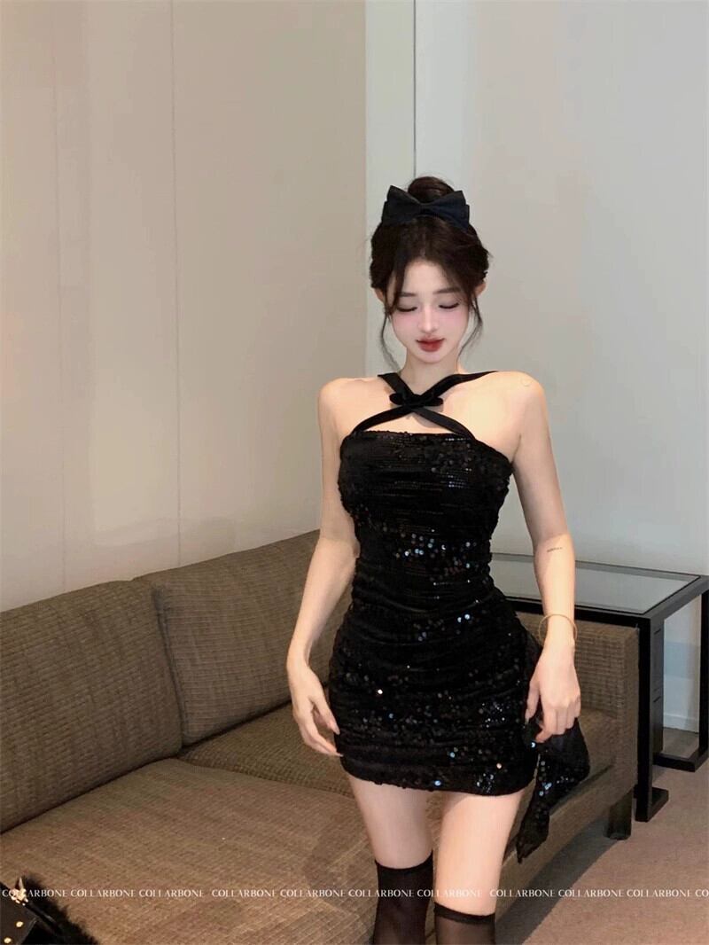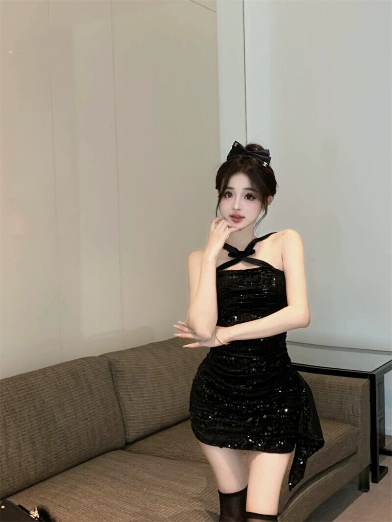 重工業スパンコールボウサスペンダードレス女性の春のセクシーなホットガールリトルブラックドレススリムフィットヒップショートスカート リボン スプリング 春物 bstraw42327204468 | beaute25