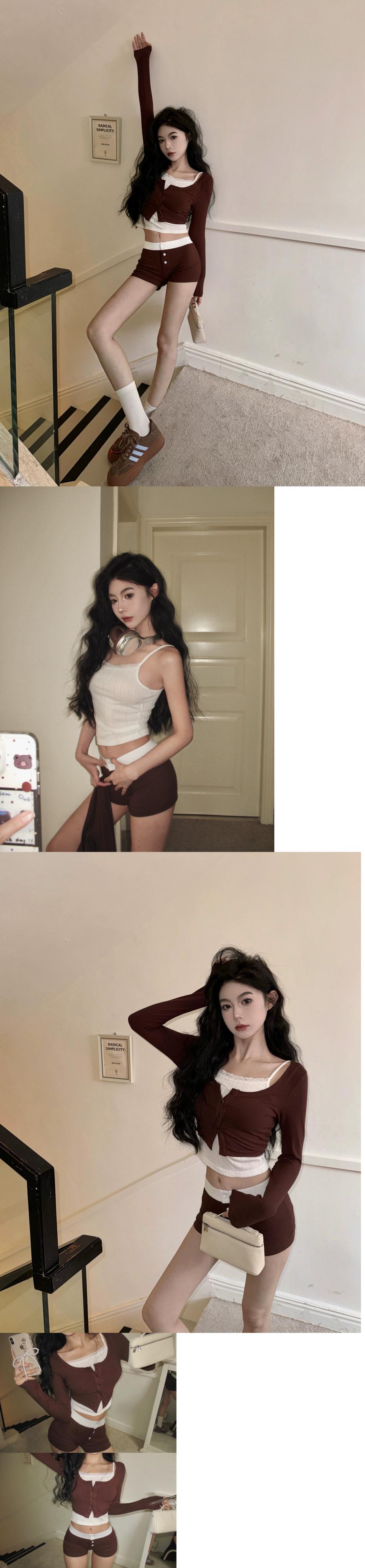 色:レーススリング,ブラックカーディガン,グレーのカーディガン,コーヒー色のカーディガン,黒のショートパンツ,グレーのショートパンツ,コーヒーカラーショーツ
