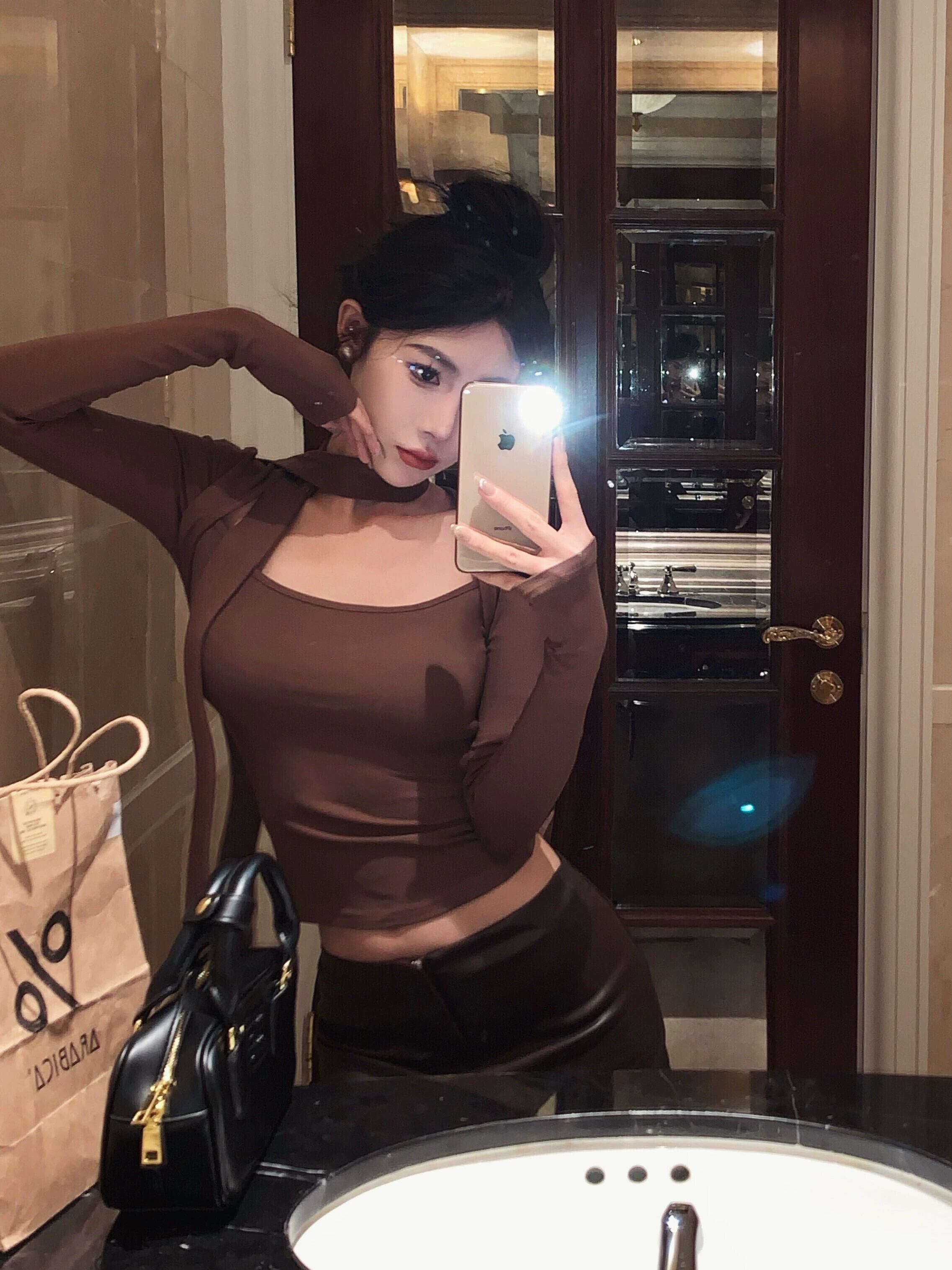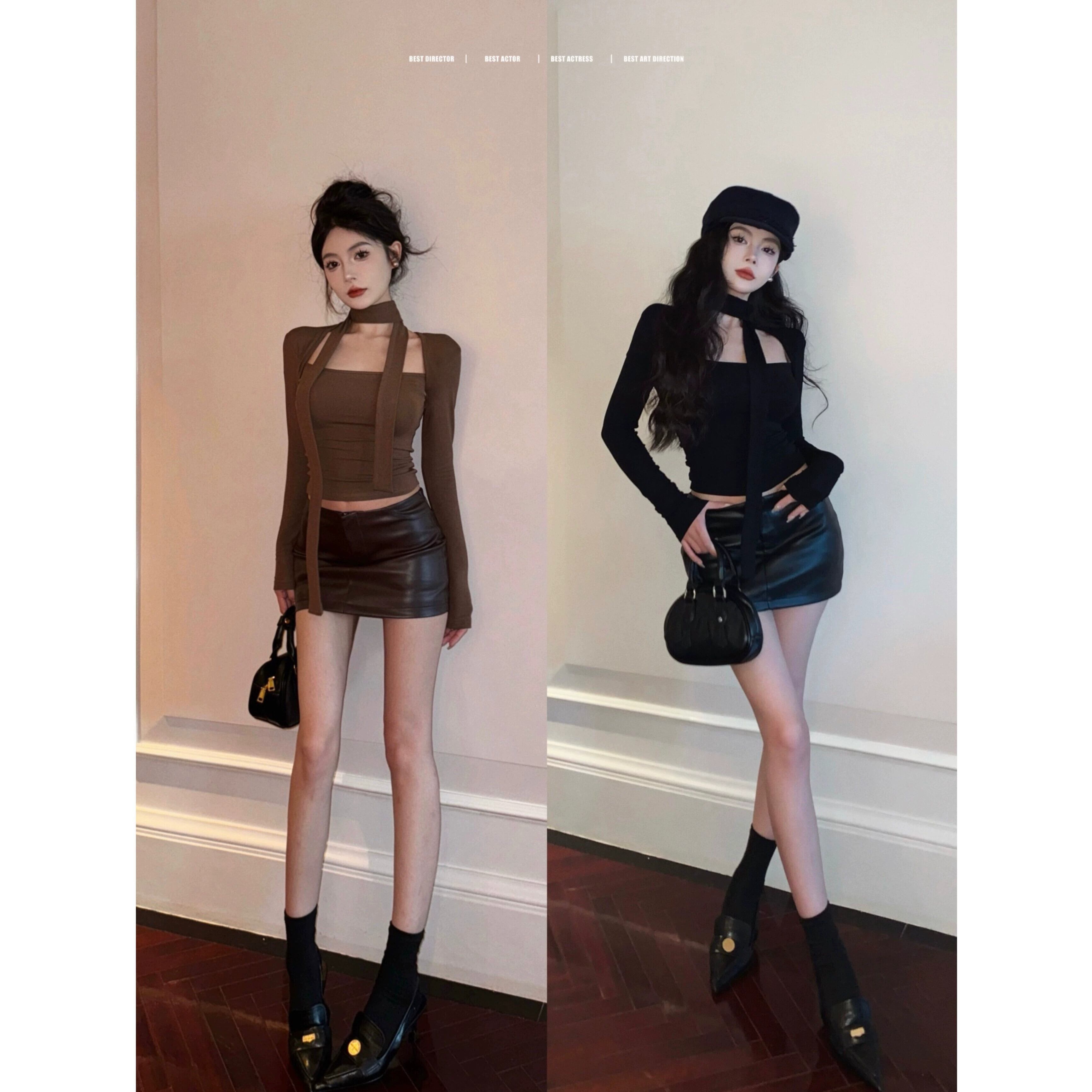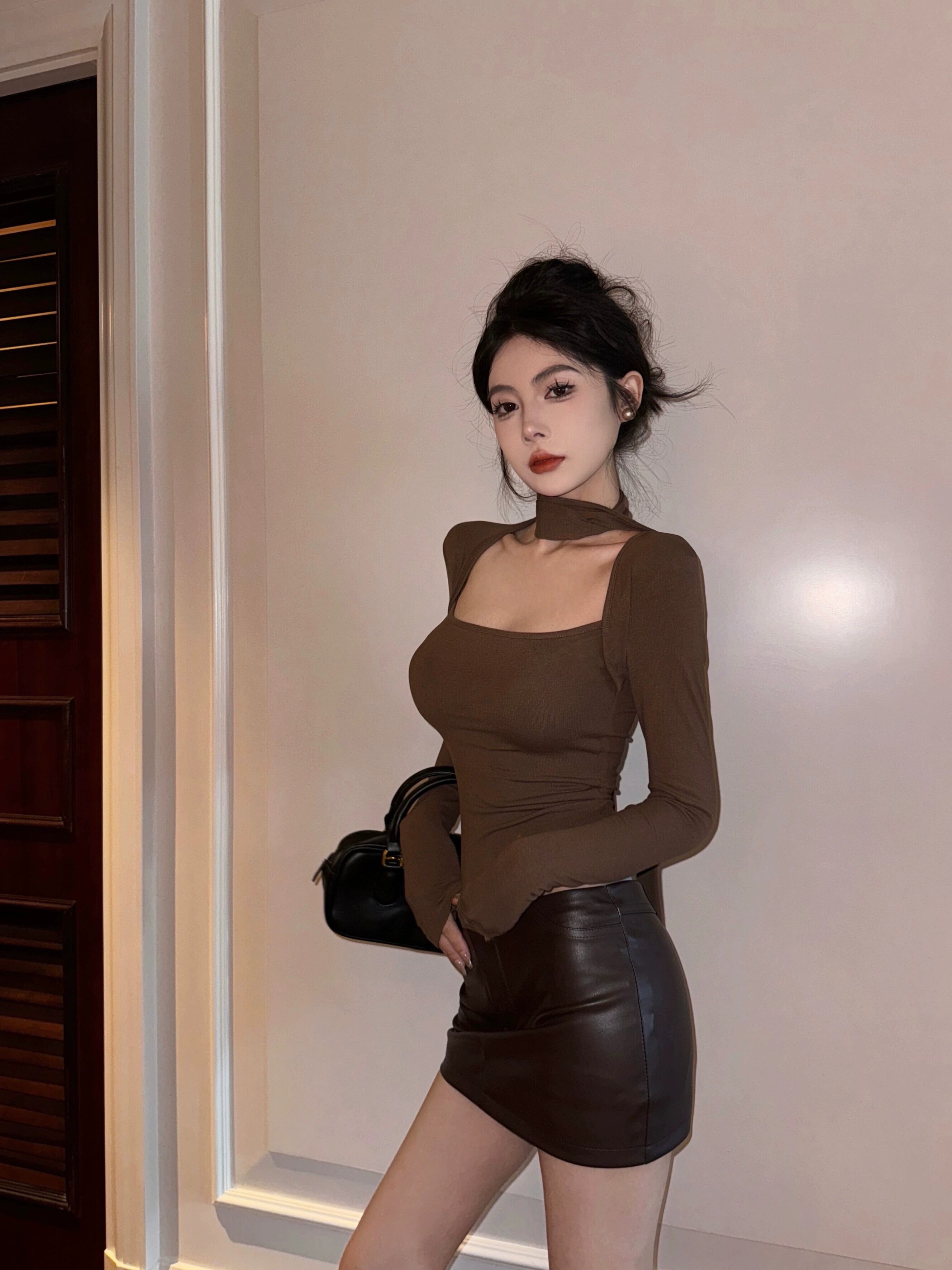 色:ブラックトップ,コーヒートップ,黒革のスカート,コーヒー色のレザースカート