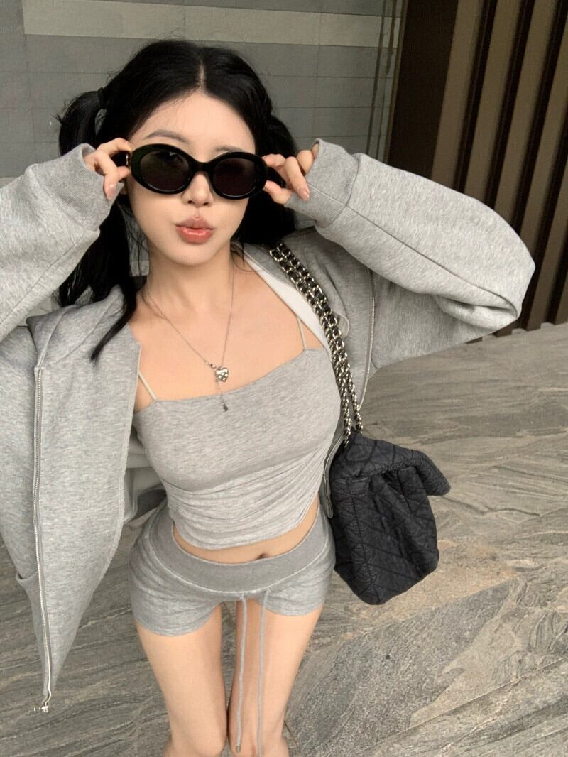 フード付きジッパートレーナージャケット女性春プチカジュアルスポーツスーツハイウエストストレートショーツ 2 点セット スプリング 春物 ブルマー bstraw25295686972 | beaute25