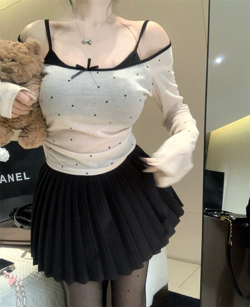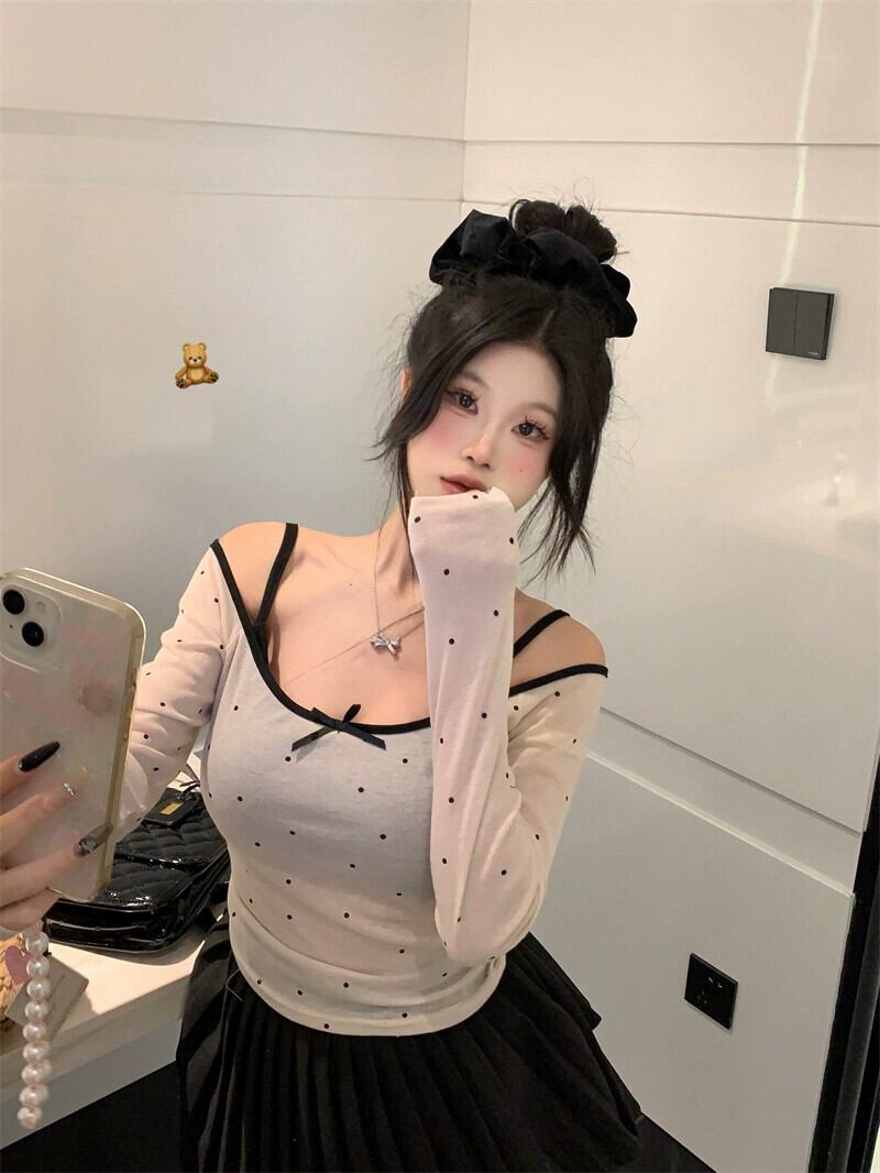 ワンショルダー水玉Tシャツ、長袖レディーススプリングサスペンダートップ、レイヤードツーピーススーツ、ショートスタイル、インナーレイヤリングシャツ ロング レッド 春物 bstraw60281234035 | beaute25