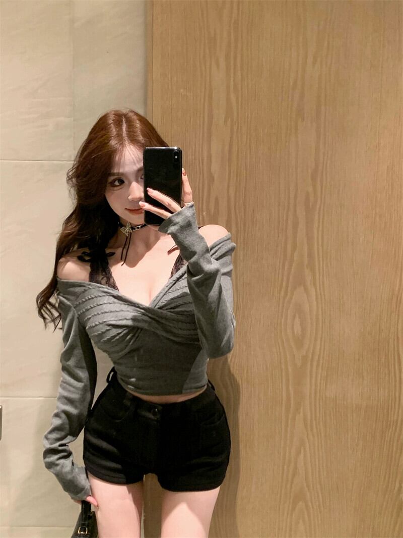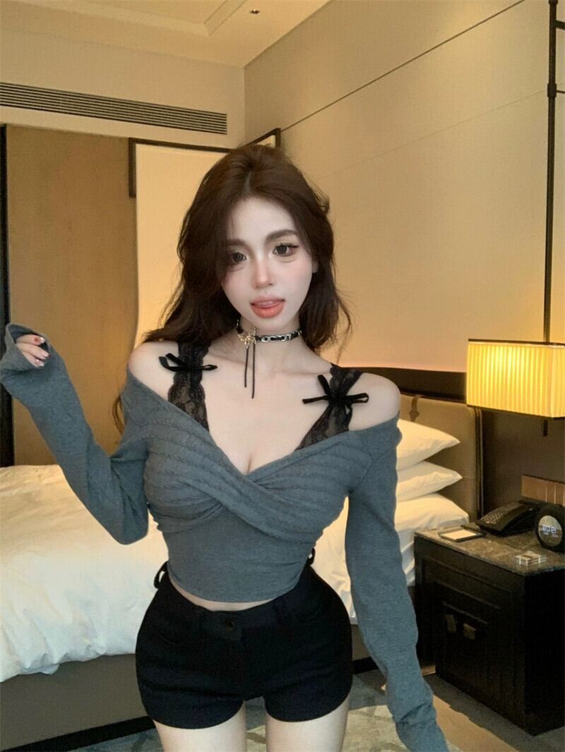 偽ツーピースレース底シャツ長袖 Tシャツ女性春の新セクシーなオフショルダー純粋な欲望スタイルショートインナートップ ロング スプリング 春物 ピュア bstraw67992220578 | beaute25