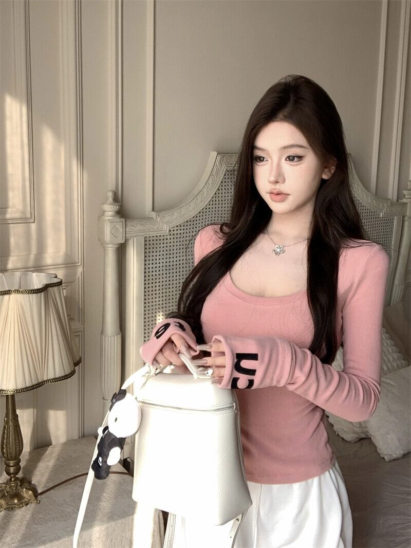 シックでユニークな女性用トップス、デザイナー長袖 U ネック T シャツ、春のピンク、スリムフィット、ローネックのインナー シャツ ロング スプリング 春物 Tシャツ bstraw11667374926 | beaute25