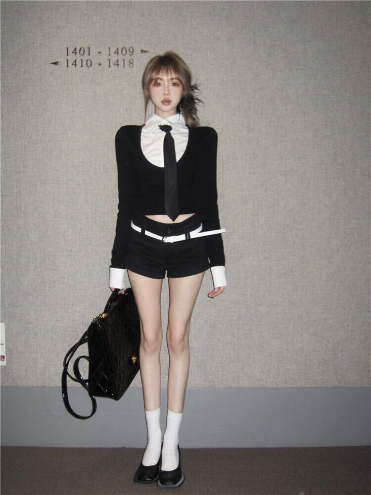 フェイクツーピースコントラストカラーポロカラー長袖 Tシャツトップス女性春カレッジスタイルスーツカジュアルショーツ 2 点セット ロング スプリング 春物 ブルマー bstraw51594916552 | beaute25