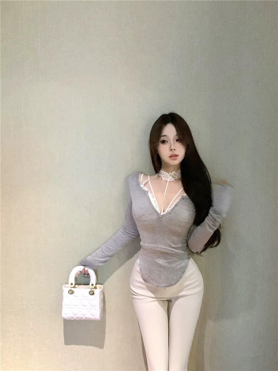 春の黒のセクシーなワンショルダー長袖Tシャツの女性、ウエストがタイト、不規則なレースのインナートップ、純粋な欲望スタイル ロング ブラック スプリング 春物 ピュア bstraw57443628395 | beaute25