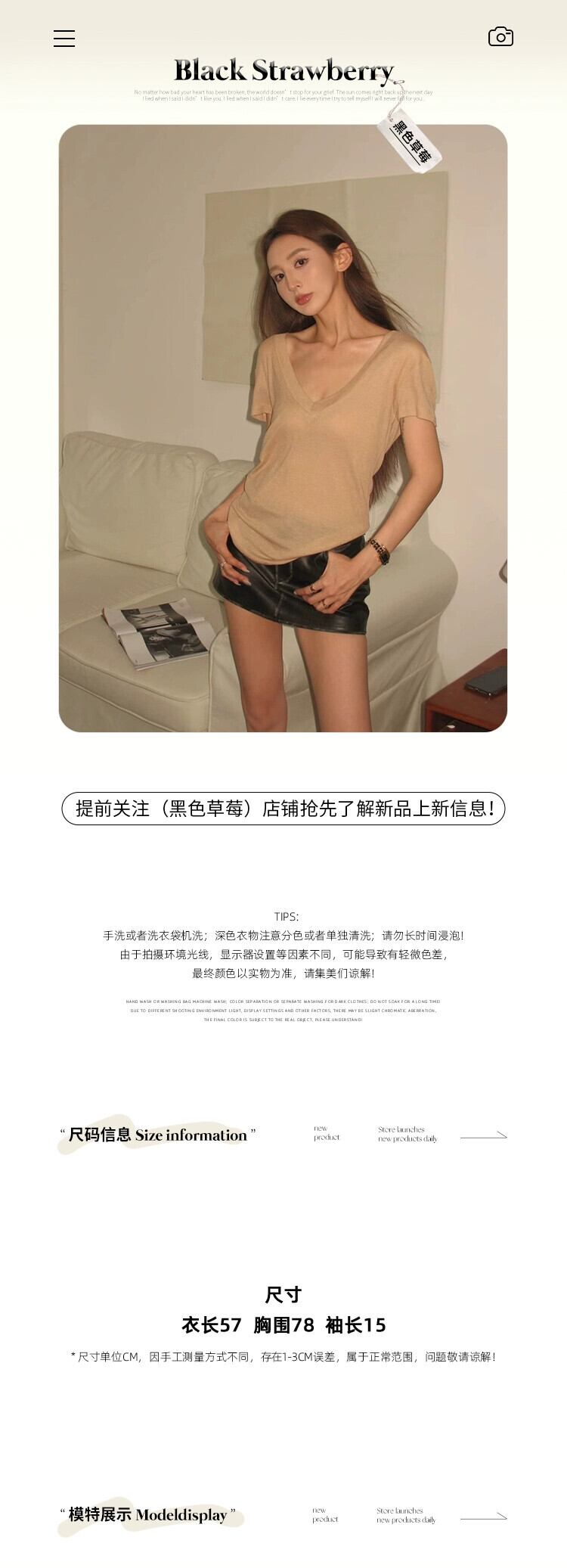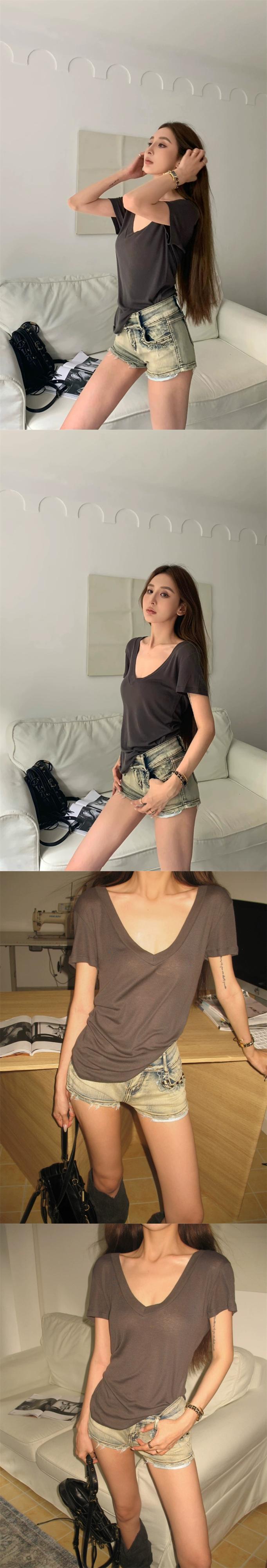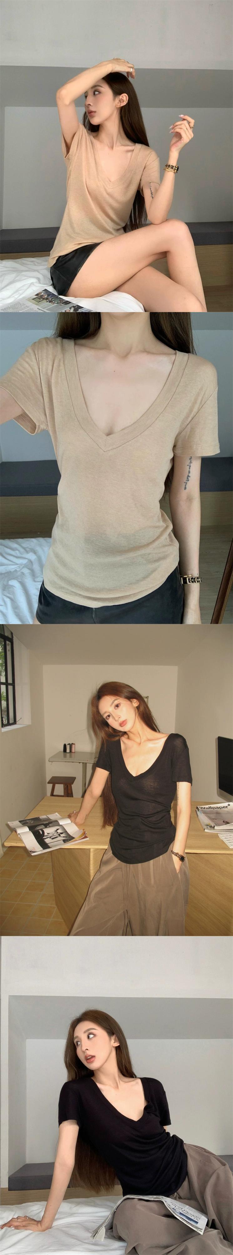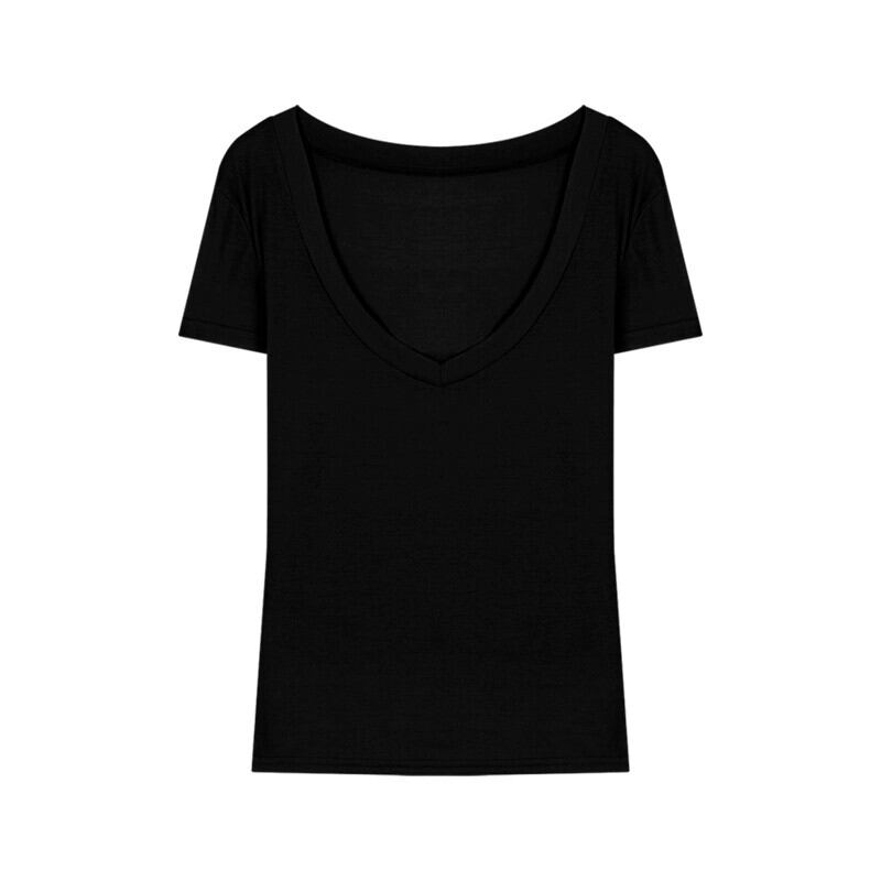 黒の V ネック半袖右肩 Tシャツ女性の夏 2024 新しいレトロスリムフィットインナー層状薄い気質底トップ レッド ブラック サマー 夏物 Vネック bstraw77142039742 | beaute25