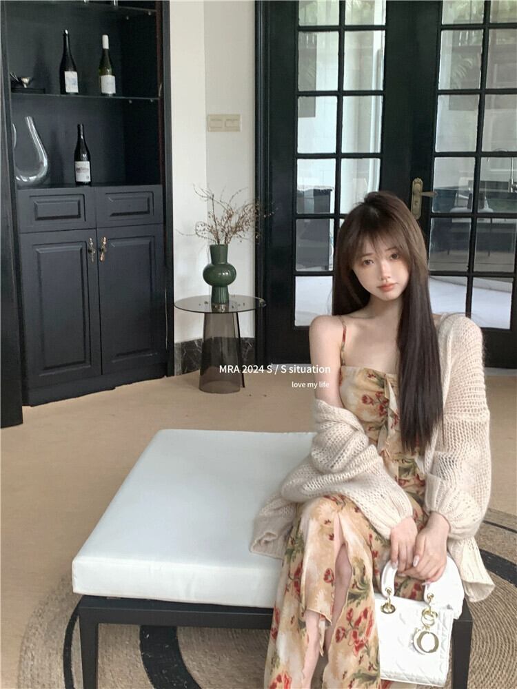 春のお茶休憩中のフランスの花柄サスペンダー ドレスの女性、そよ風、ウエストを締めるミドル丈、ヒップにぴったりとフィットする美しいスリット スカート スプリング 春物 bstraw92879997753 | beaute25