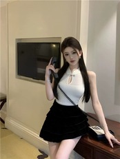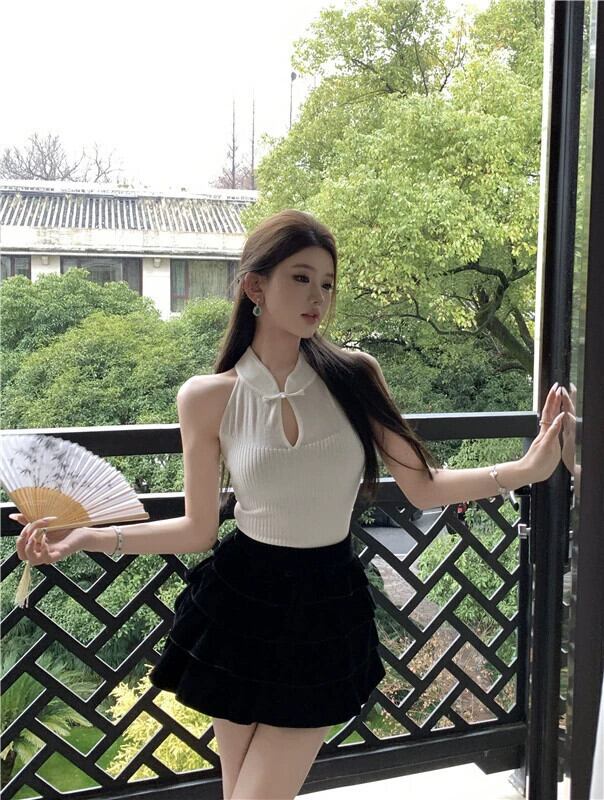 中国風のプレート バックル中空ホルターネック ノースリーブ ニット ベスト女性夏スリム フィット内側と外側に着用する国民的なスタイルのトップ サマー 夏物 bstraw54540228550 | beaute25