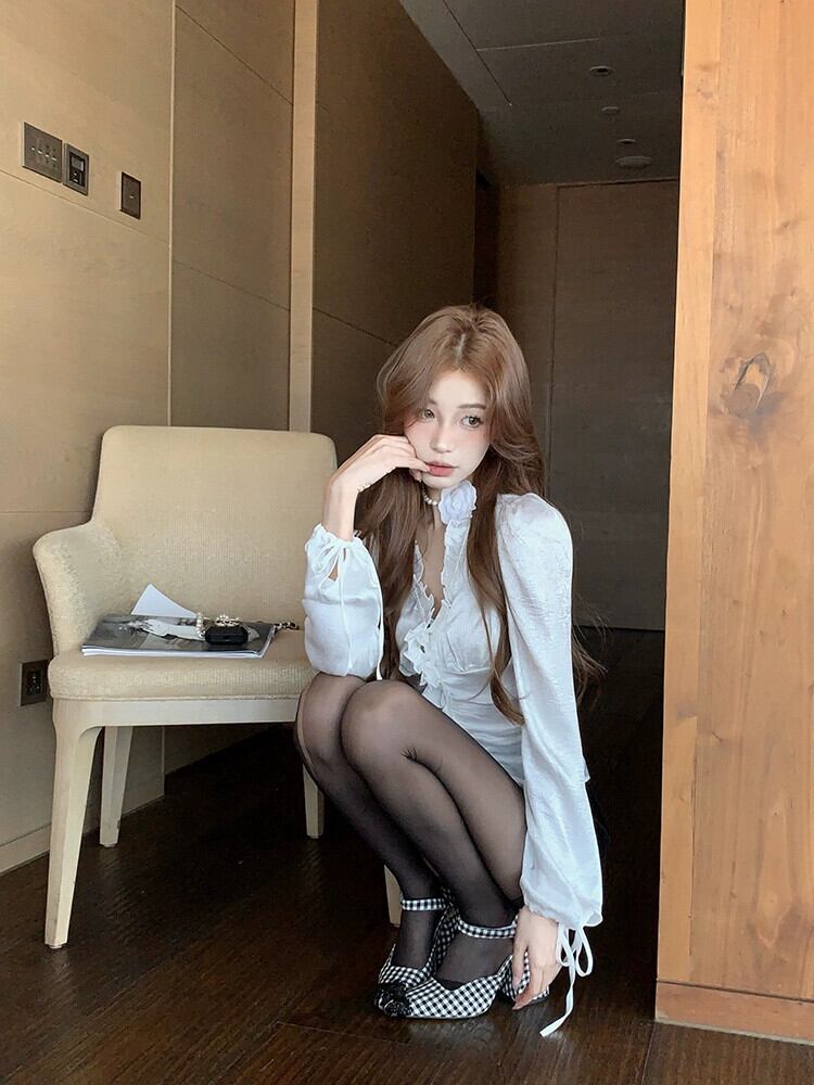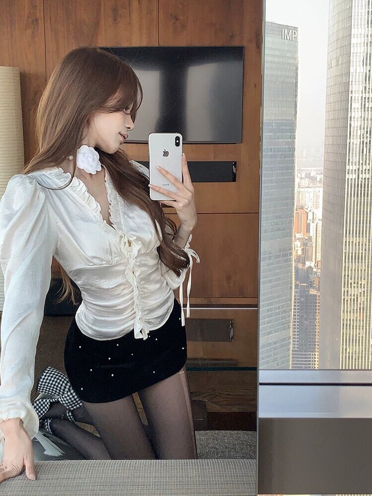白菌エッジ パフ スリーブ V ネック シャツ トップ女性の春の気質プリーツ スリム長袖ショート シャツ ロング ホワイト スプリング 春物 Vネック bstraw19358262974 | beaute25