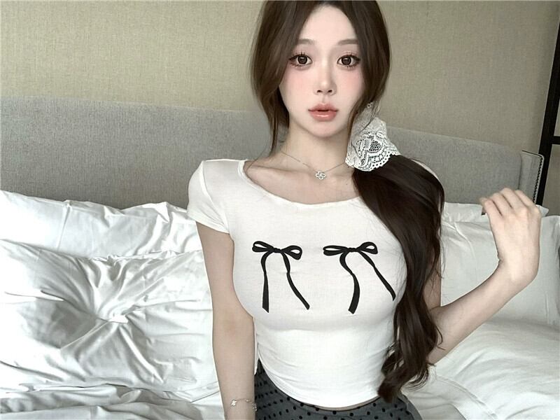 リボンプリントラウンドネック半袖 Tシャツ女性の夏のウエストタイトな白インナーショート甘辛トップ ホワイト 大人ガーリー スウィート キュート カジュアル サマー 夏物 Oネック bstraw34670968617 | beaute25