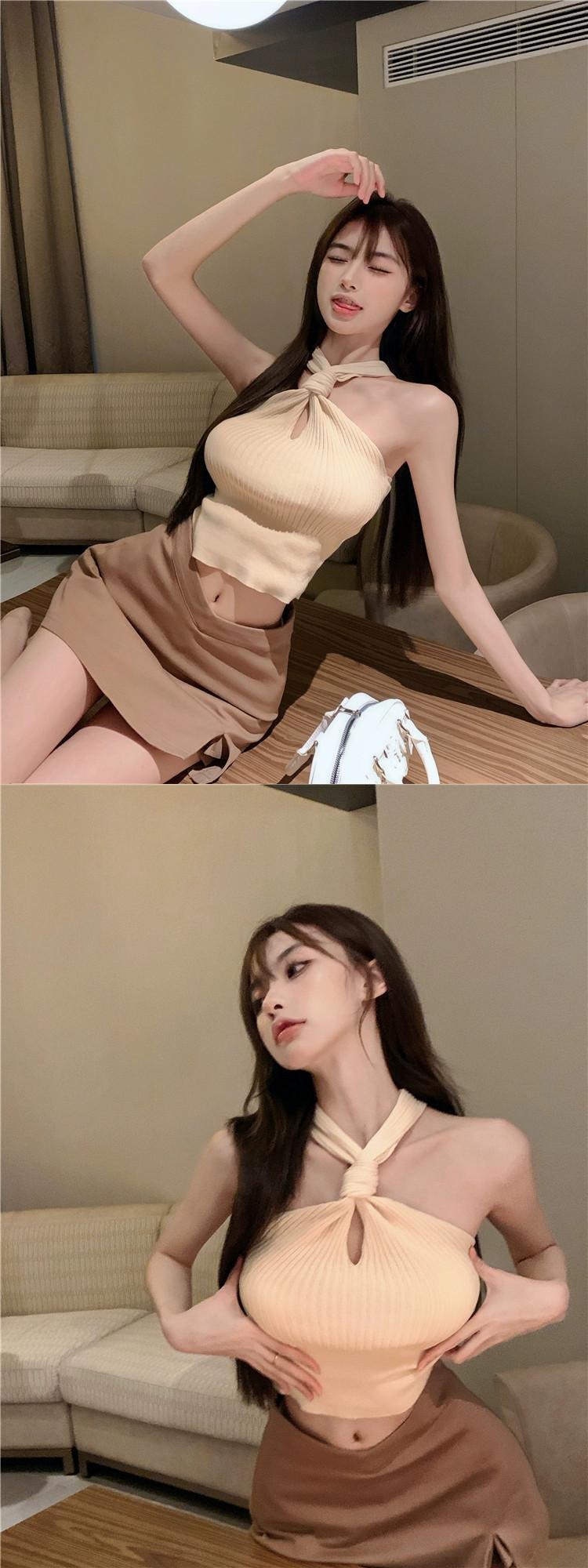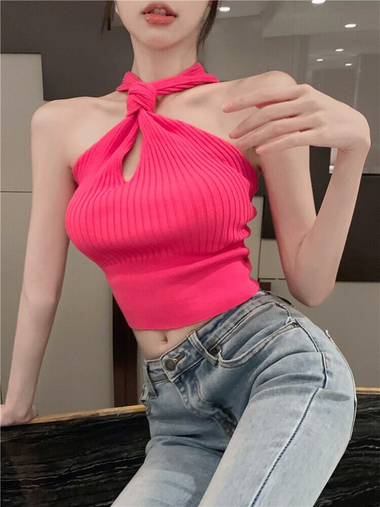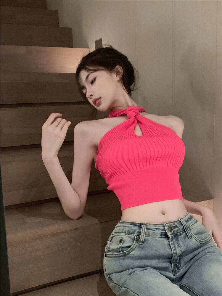 甘い中空ニットキャミソールレディース夏純粋な欲望スタイルショートホルターネックタイトインナーウェアトップ 大人ガーリー スウィート キュート カジュアル サマー 夏物 ピュア berry69876564894 | beaute25