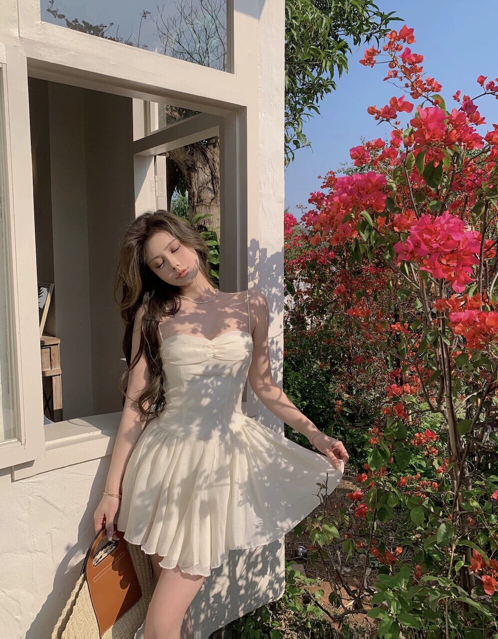 純粋な欲望ワンショルダープリーツサスペンダードレス女性の夏の白い甘いネクタイショートスカートセクシーなウエストプリンセススカート ホワイト 大人ガーリー スウィート キュート カジュアル サマー 夏物 berry89146498535 | beaute25