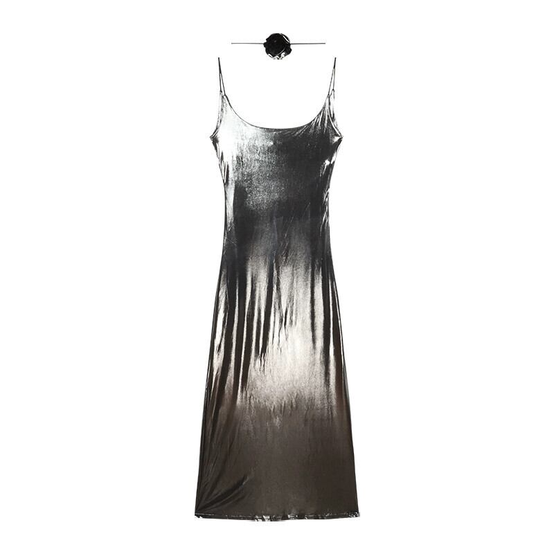 シルバー ストレッチ ロング サスペンダー ドレス レディース 夏 タイト スリット フィッシュテール スカート バックレス ノースリーブ ヒップ スカート サマー 夏物 銀 berry94803133290 | beaute25