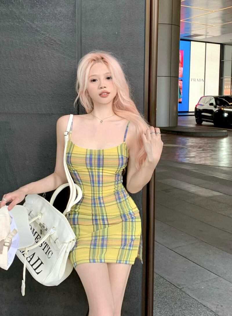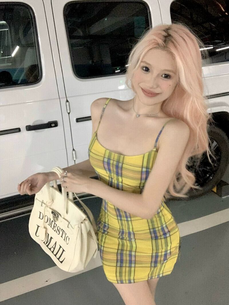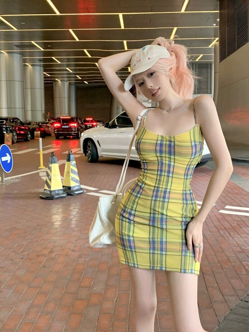 黄色の格子縞のサスペンダー ドレスの女性、夏の気質、ヒップハグのショート スカート、セクシーなウエスト タイト、バックレス スカート サマー 夏物 berry87634212700 | beaute25