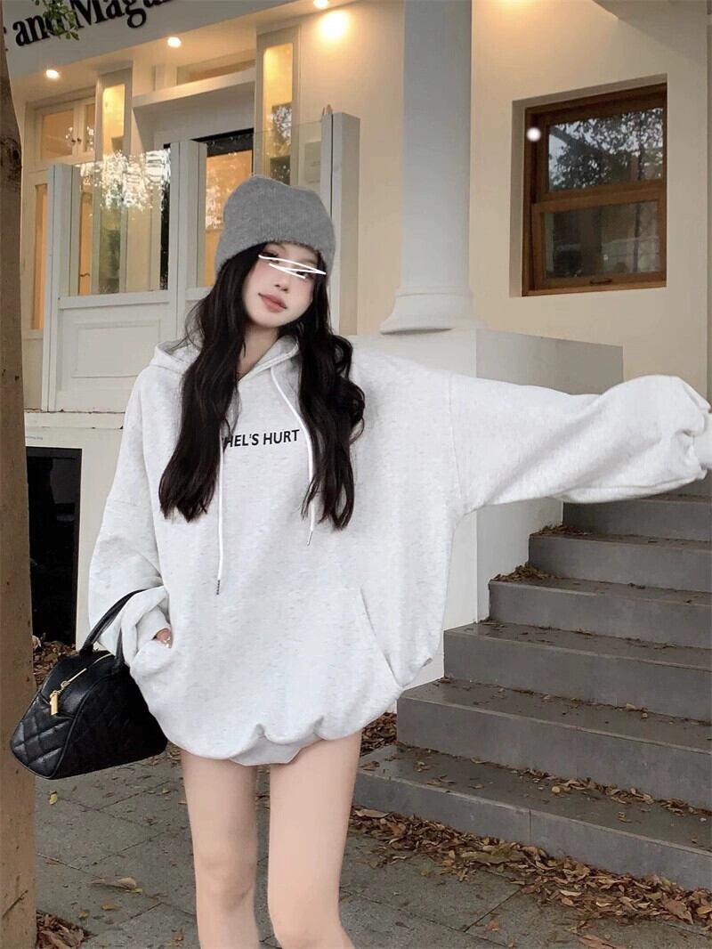 グレーの長袖フード付きスウェットシャツの女性、秋と冬のルーズなプルオーバーコート、怠惰なスタイル、ミッドレングスのレタープリントトップ ロング オータム 秋物 ウィンター 冬物 berry11876473341 | beaute25