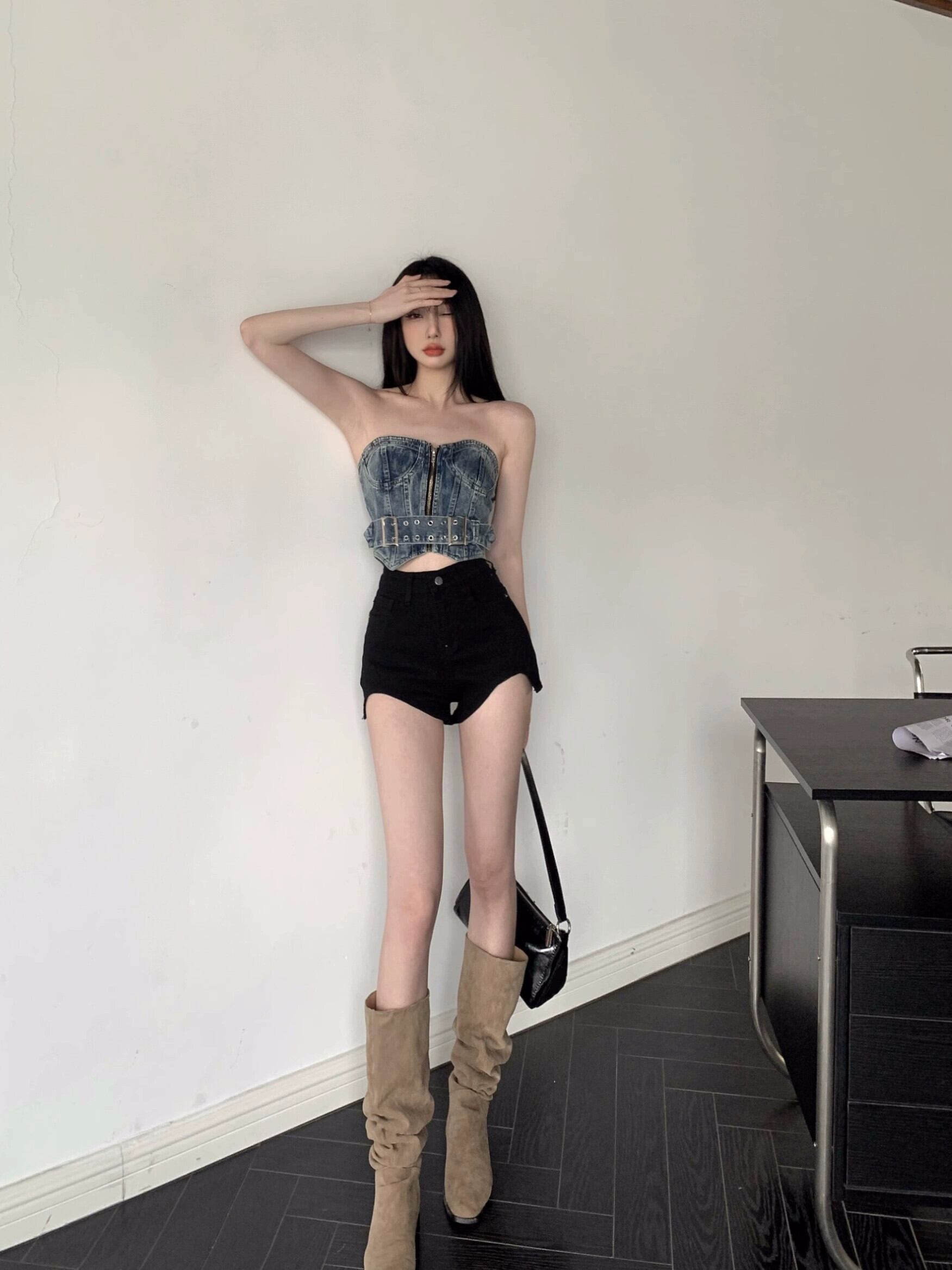 ホットデニムスーツチューブトップベスト女性夏 2023 新しいセクシーなハイウエストパンツショーツ 2 点セット ハイウェスト サマー 夏物 ブルマー berry77272760547 | beaute25