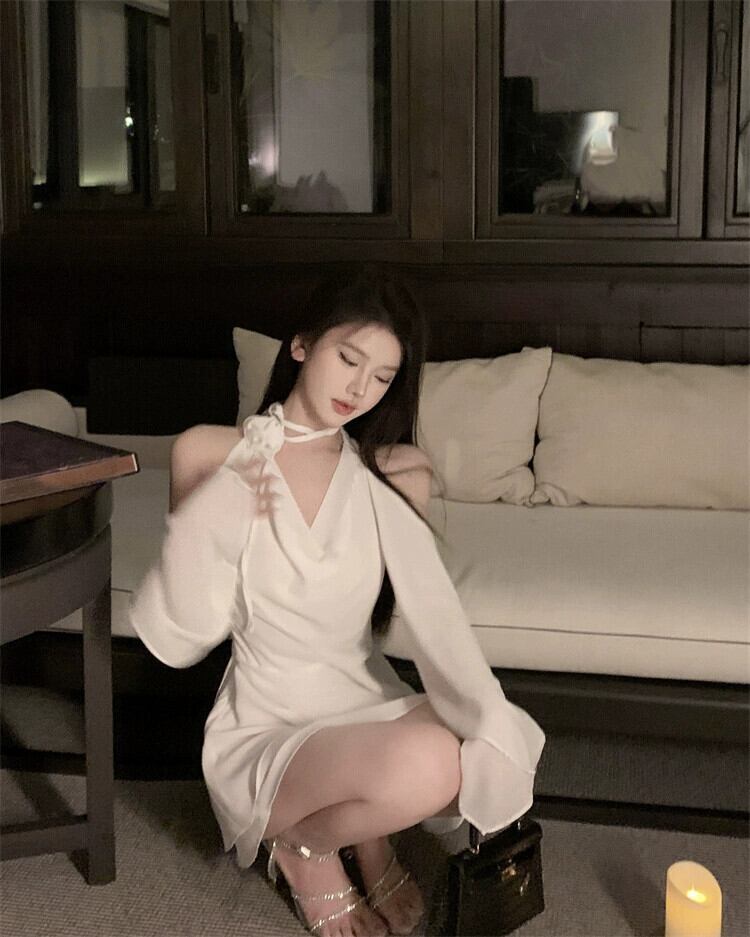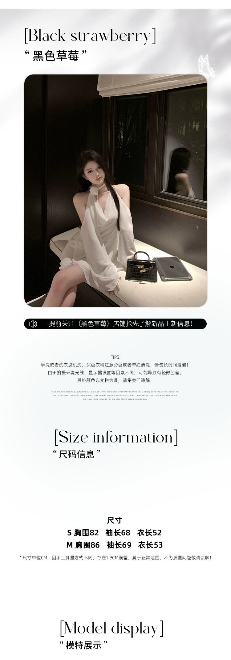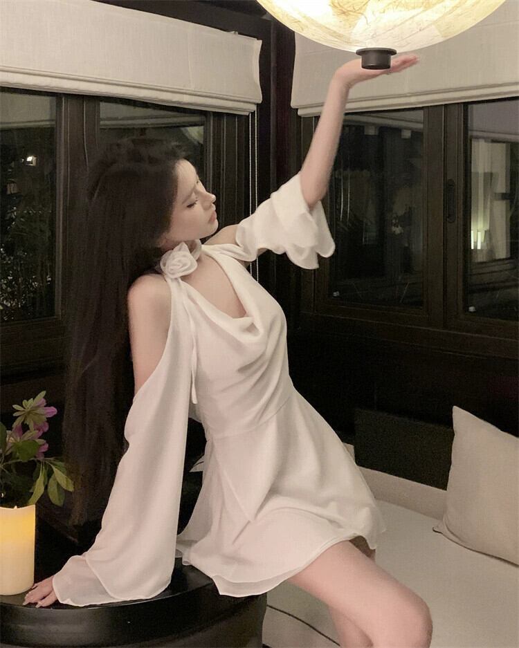 フレンチホワイトシフォンホルタードレス妖精春の花長袖スカートスーパー妖精ハイエンド気質ショートスカート ロング スプリング 春物 フラワーデザイン berry23293382992 | beaute25