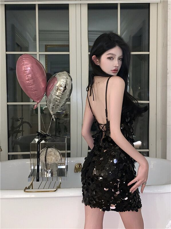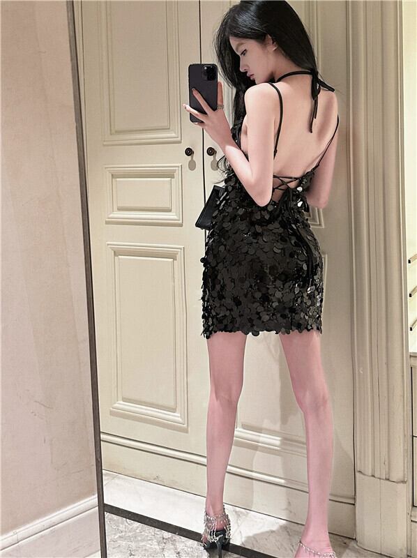 ホットホルターネックサスペンダードレス女性の夏の重工業スパンコールスカートセクシーな背中の開いた光沢のあるヒップスカートショートスカート サマー 夏物 berry94102535895 | beaute25