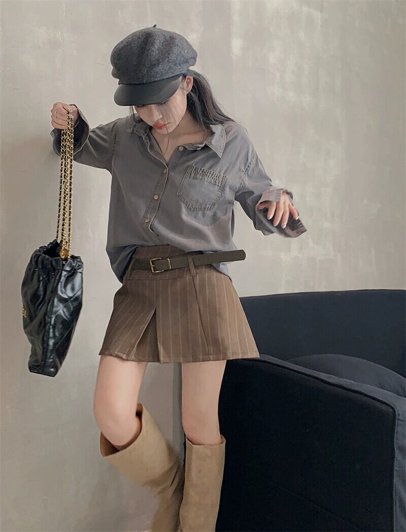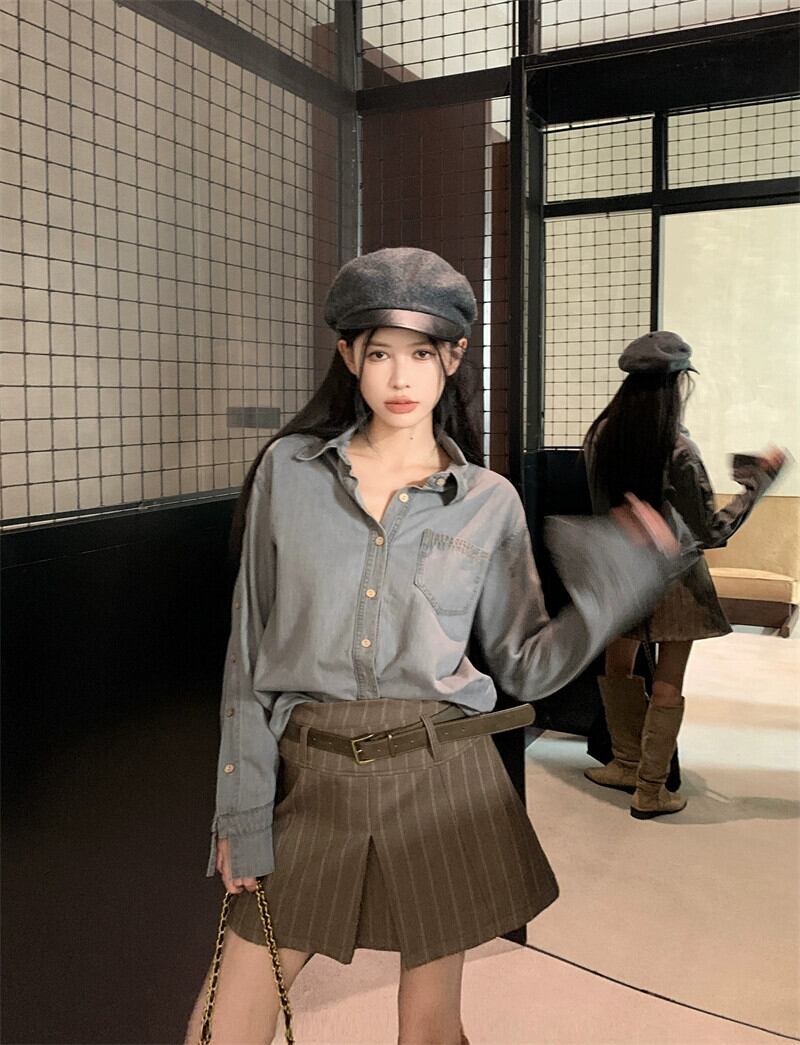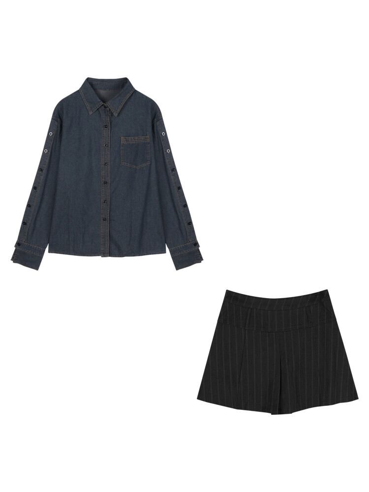 レトロファッションスーツ女性の秋と冬ルーズデニムシャツ長袖トップストライプスカートショートスカート 2 点セット ロング オータム 秋物 ウィンター 冬物 berry56112790675 | beaute25