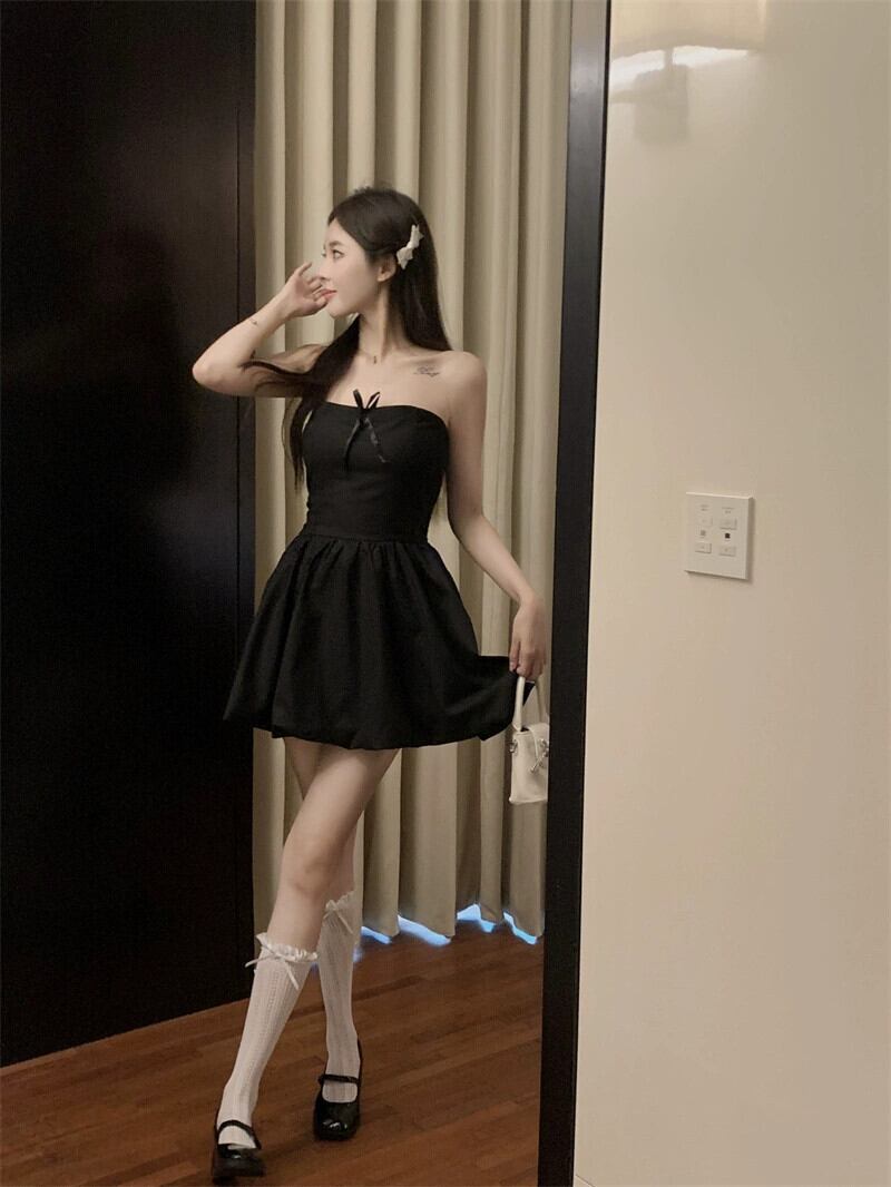 甘いグレーのチューブトップドレス女性の夏フレンチリボンスカートウエスト背中の開いたふくらみのあるAラインスカート 大人ガーリー スウィート キュート カジュアル サマー 夏物 berry84082542286 | beaute25