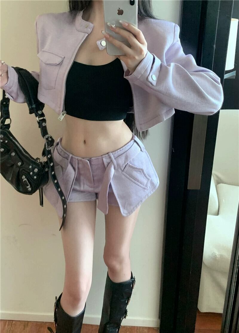 ホットスタイルスーツ女性春ショート長袖カーディガンジャケットトップタイトショーツパープルハイエンドツーピースセット ロング スプリング 春物 ブルマー berry46239213449 | beaute25