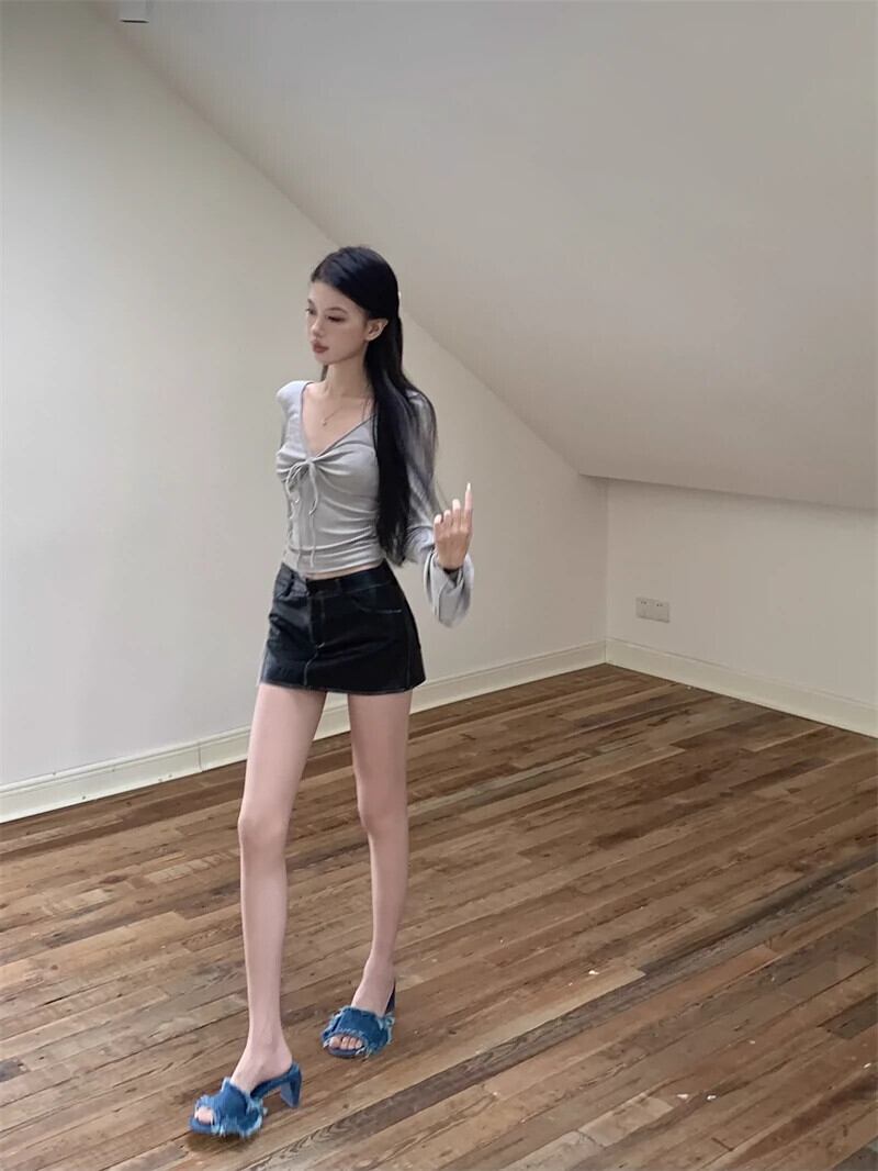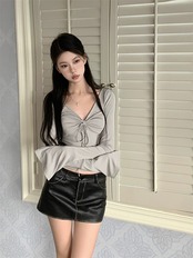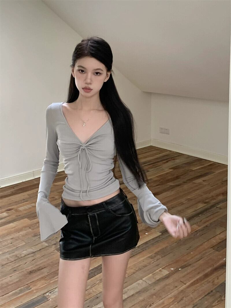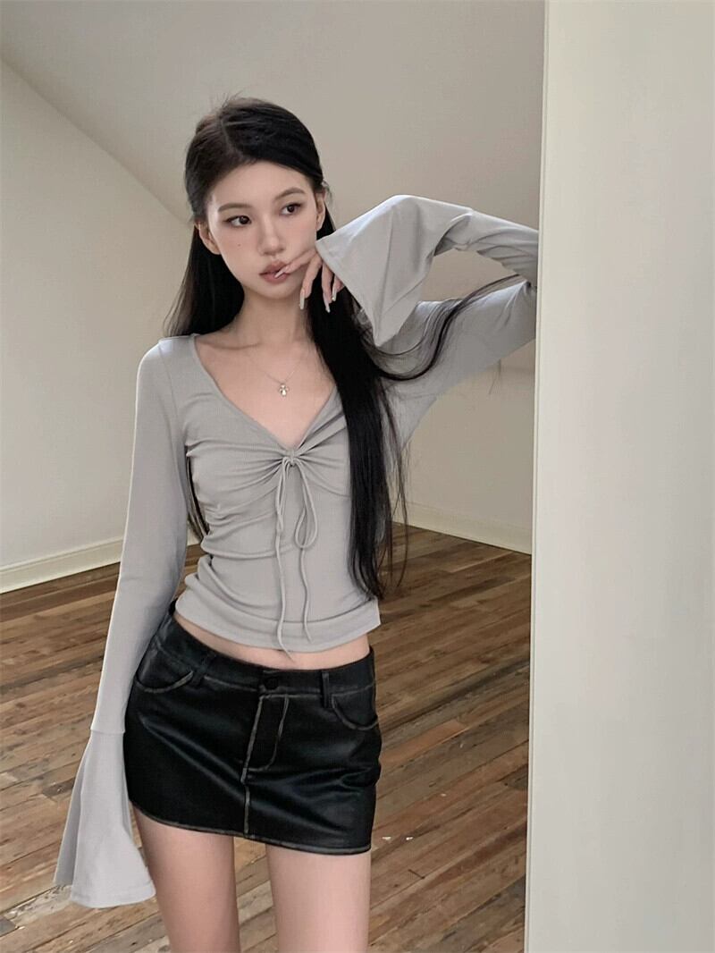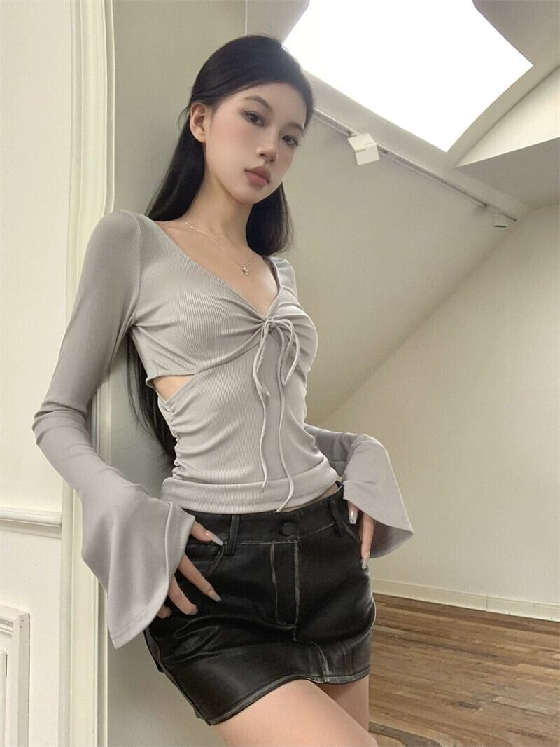 春の気質を持つグレーの V ネック長袖右肩 T シャツの女性、スリムなデザイン、レースアップ中空底シャツ トップ ロング スプリング 春物 Vネック Tシャツ berry30457148367 | beaute25