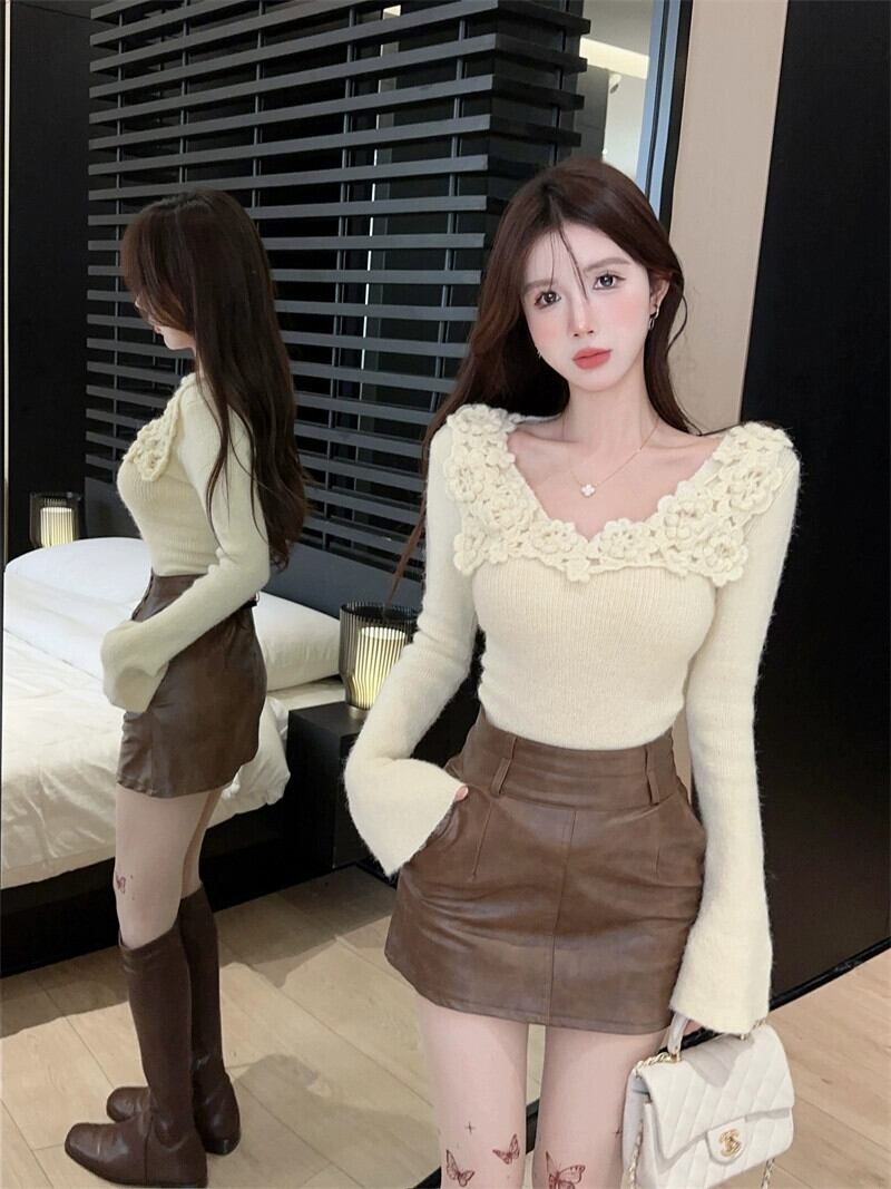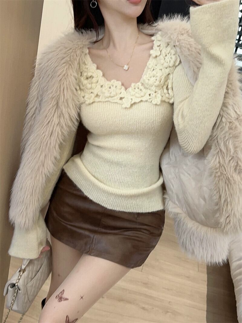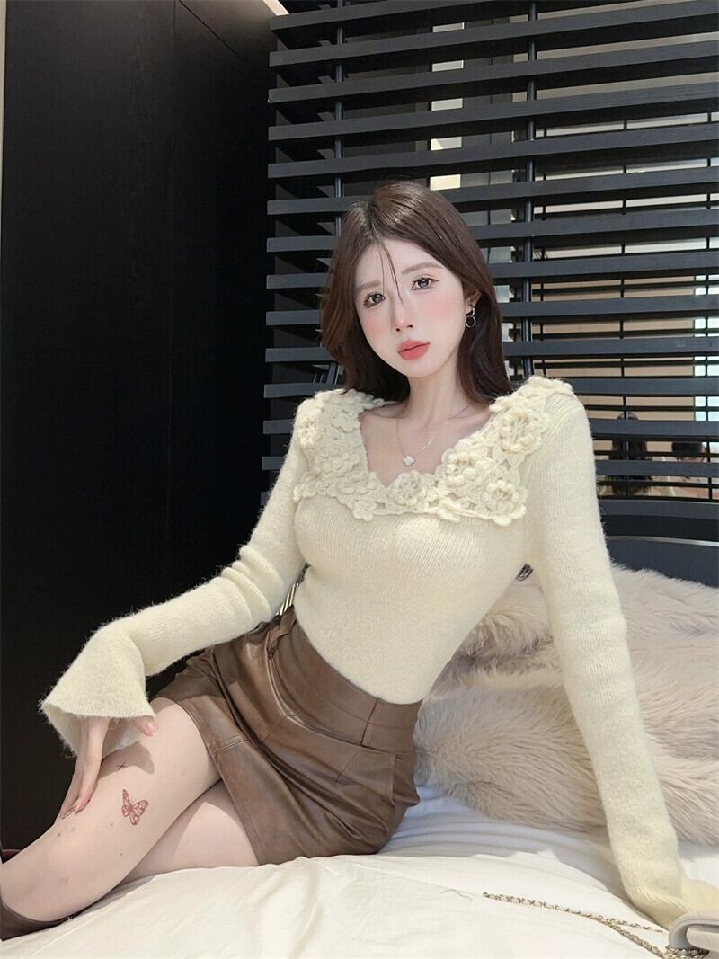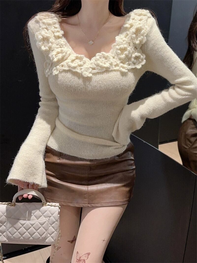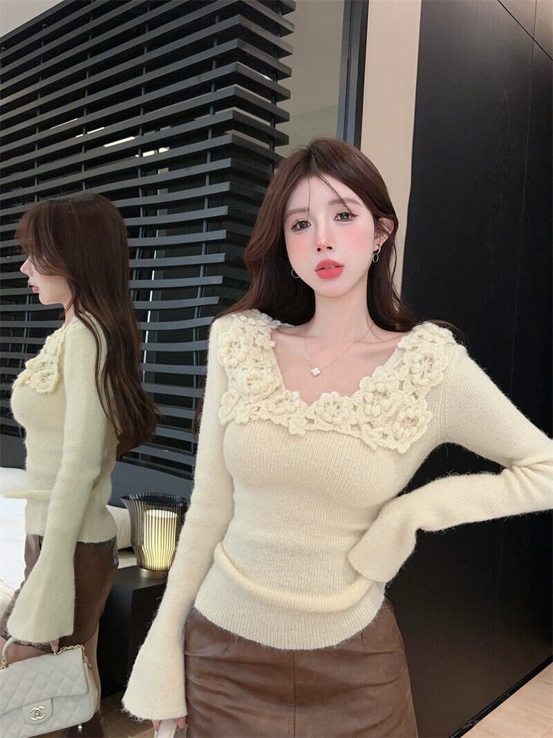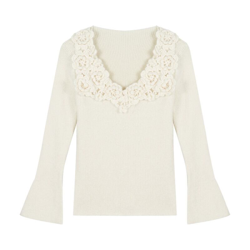 立体花長袖 V ネックセータートップレディース春フレンチジェントルスタイルスリムフィットインナーベースセーター ロング スプリング 春物 Vネック フラワーデザイン berry8523065161 | beaute25