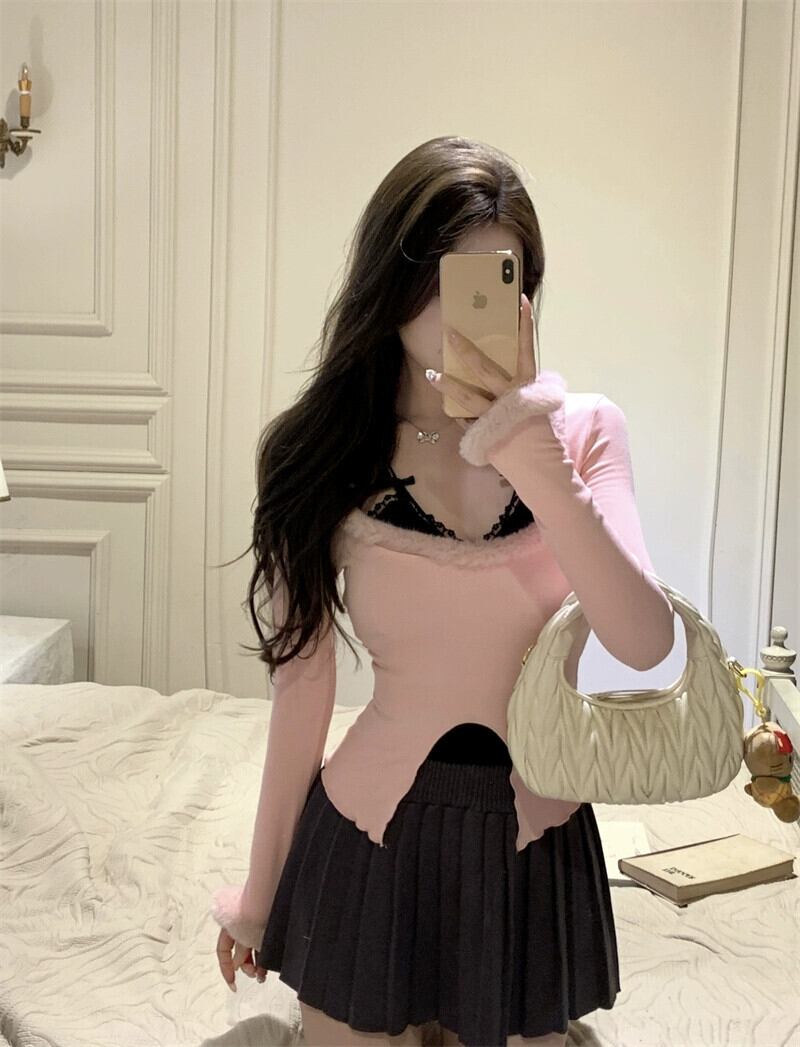 ピンクのスプライスレース不規則な長袖Tシャツレディース春スリムフィットショートスタイルインナーフェイクツーピースピュアラストトップ ロング スプリング 春物 berry77849348285 | beaute25