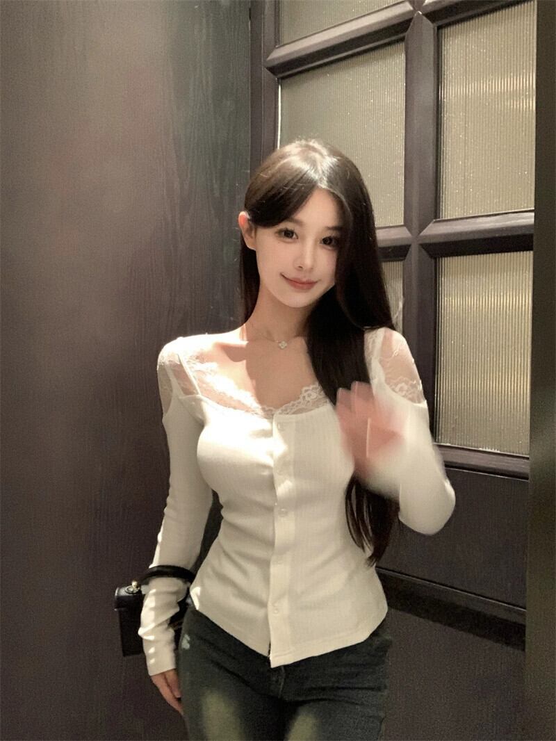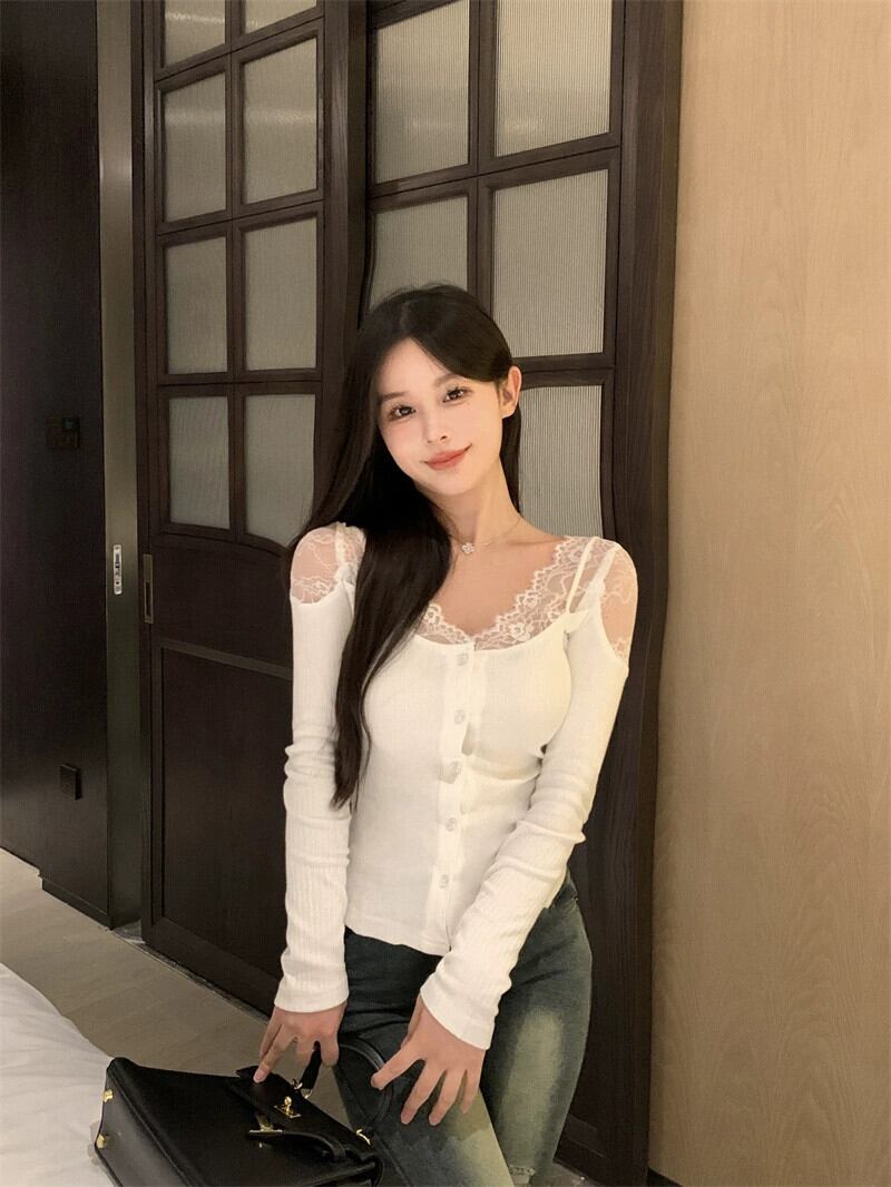 黒レーススプライシング長袖セーター女性秋と冬のセクシーな純粋な欲望スリムショートトップとボトリングシャツ ロング ブラック オータム 秋物 ウィンター 冬物 ピュア berry92325996178 | beaute25