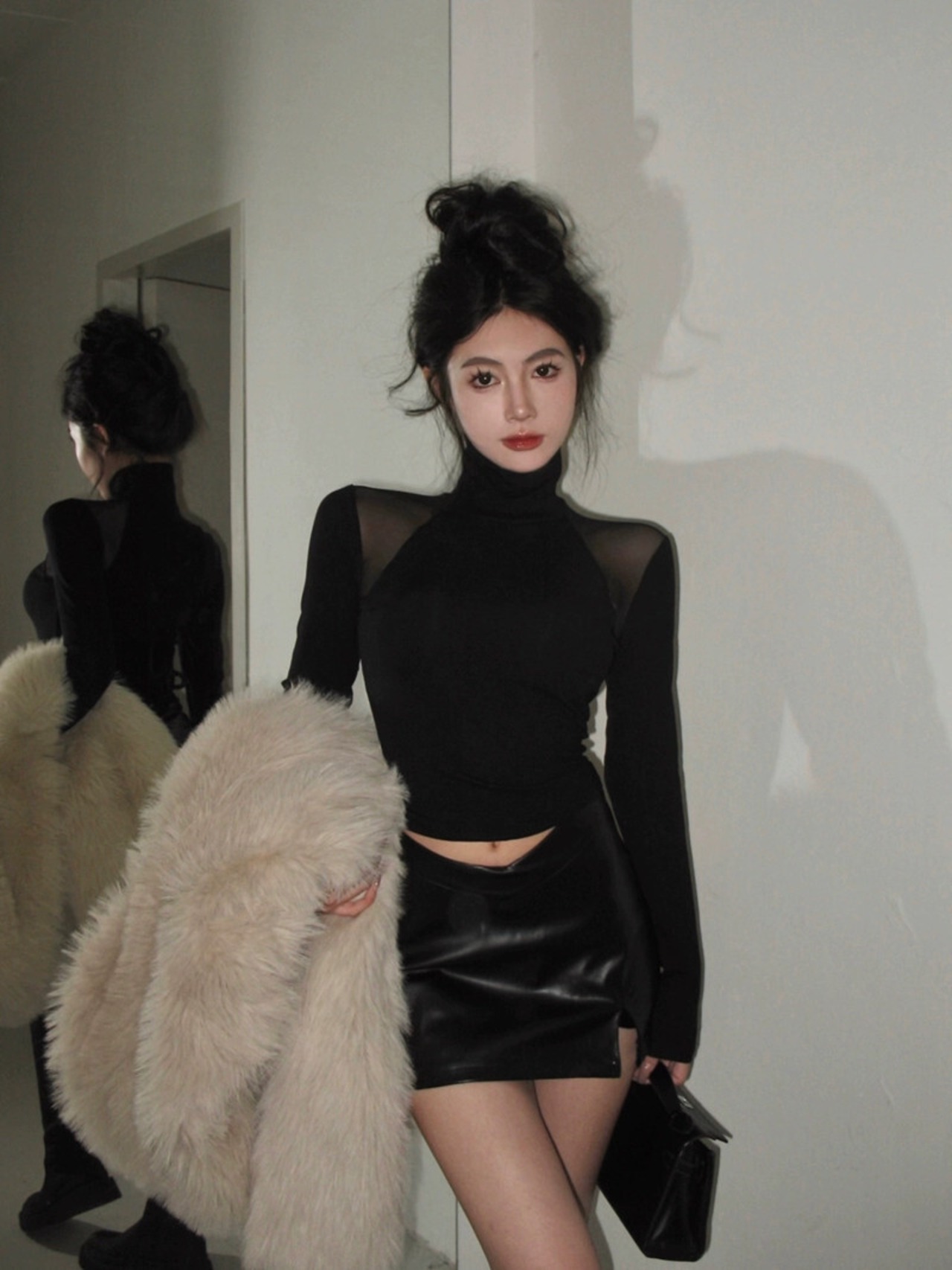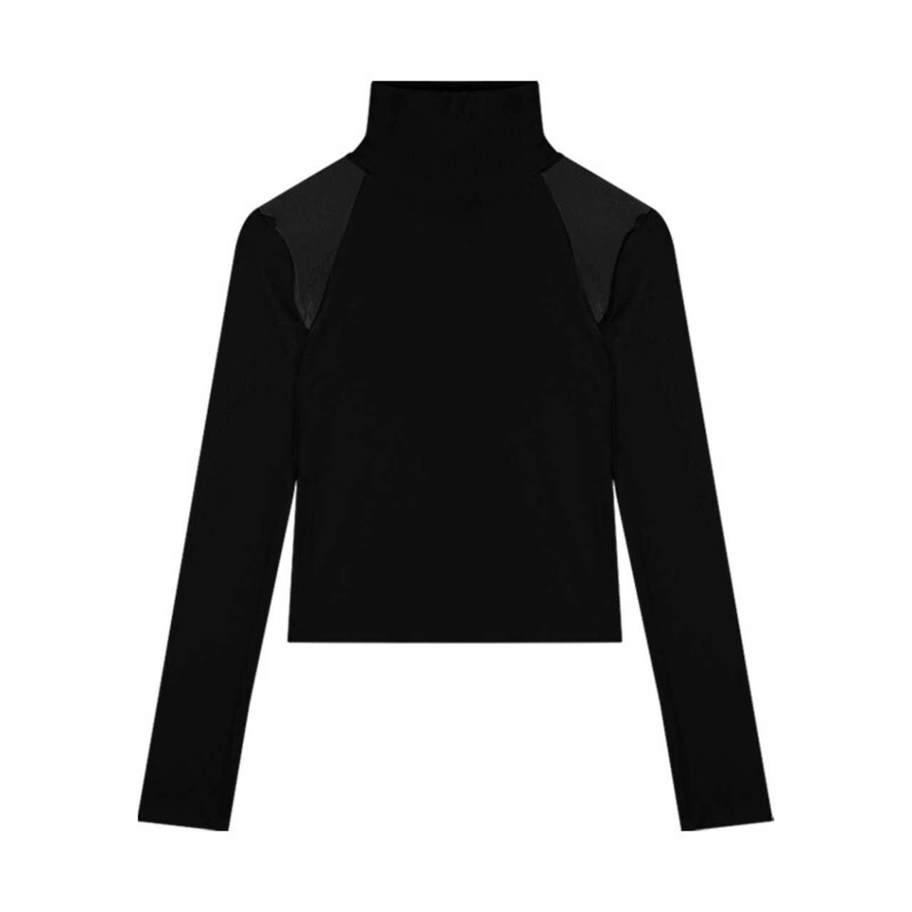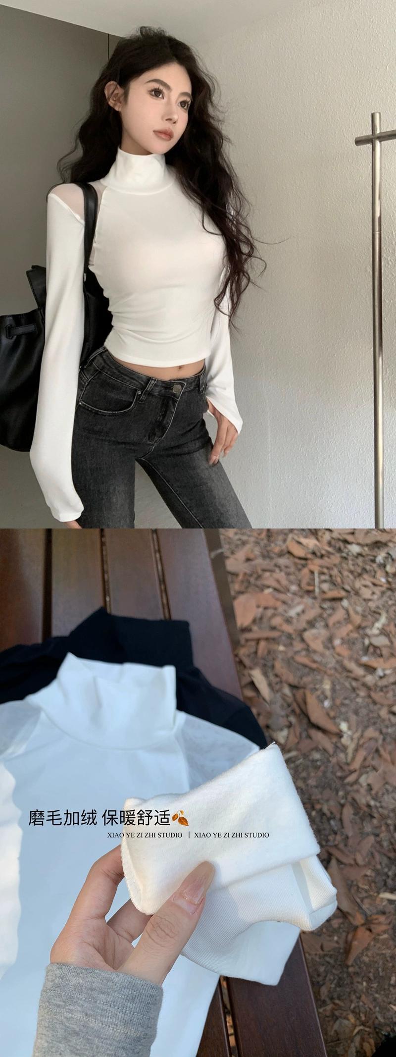 メッシュスプライシングハイカラープラスベルベットボトムシャツ長袖 Tシャツ女性冬黒ショートスリムフィット暖かいインナートップ ロング ブラック ウィンター 冬物 berry91909889356 | beaute25