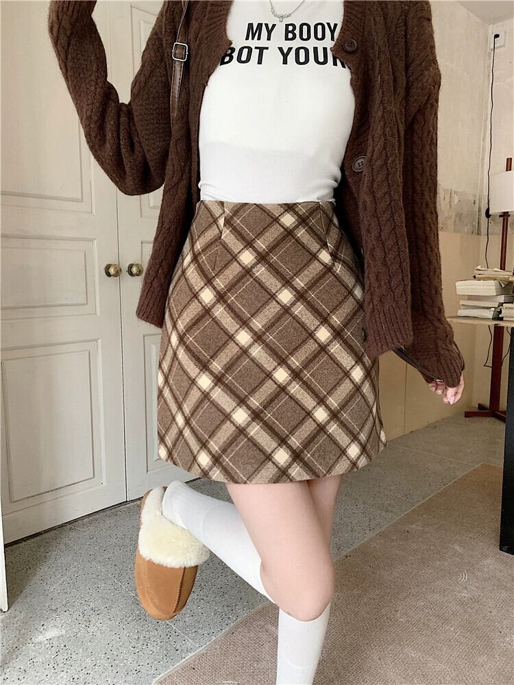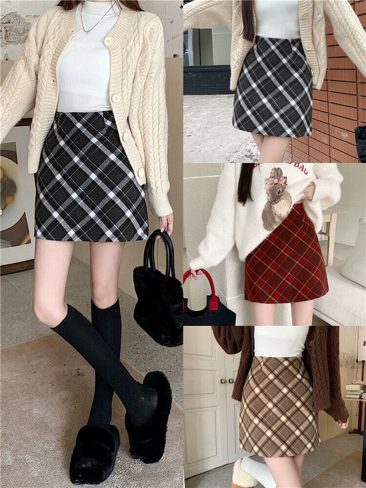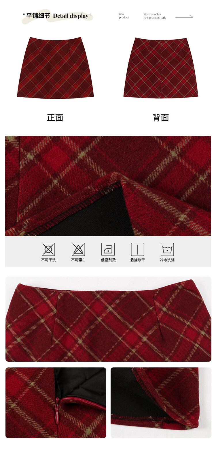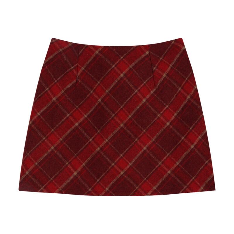 春の赤チェック柄Aラインスカート、ハイウエスト、ヒップカバーショートスカート、小柄な露出防止ウールスカート ハイウェスト レッド スプリング 春物 berry82828038433 | beaute25
