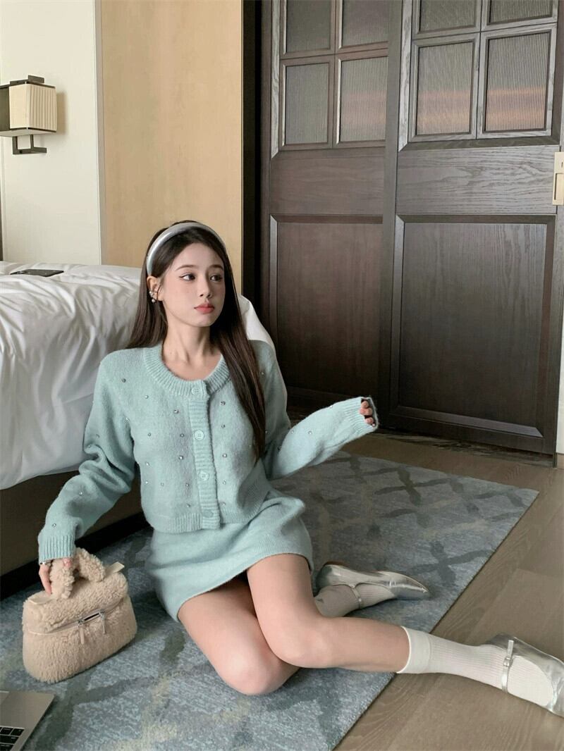 重工業ダイヤモンド散りばめ長袖ニットセーターカーディガンレディース春カジュアルスーツヒップカバーハーフレングスショートスカート 2 点セット ロング スプリング 春物 berry86907697868 | beaute25