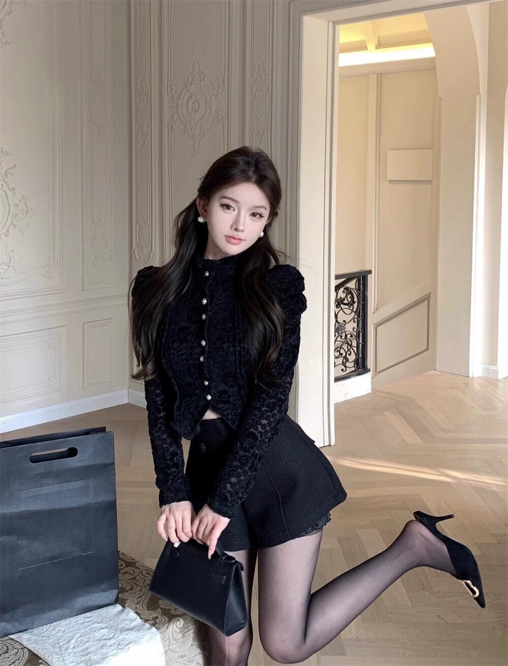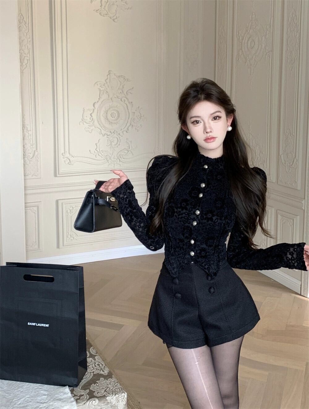 色:レースシャツ,黒のショートパンツ