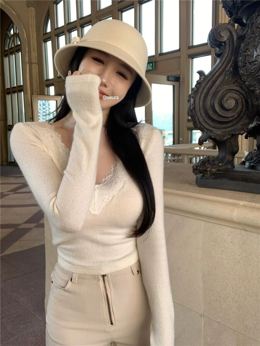 ステッチレース V ネック長袖 Tシャツ女性冬肥厚スリムフィットインナーショート純粋な欲望スタイルボトリングシャツ ロング ウィンター 冬物 Vネック ピュア berry83598259310 | beaute25