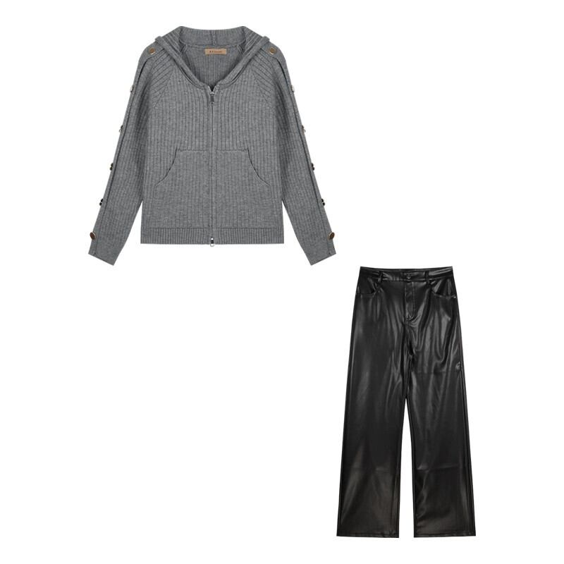 色:グレーのカーディガン,レザーパンツ