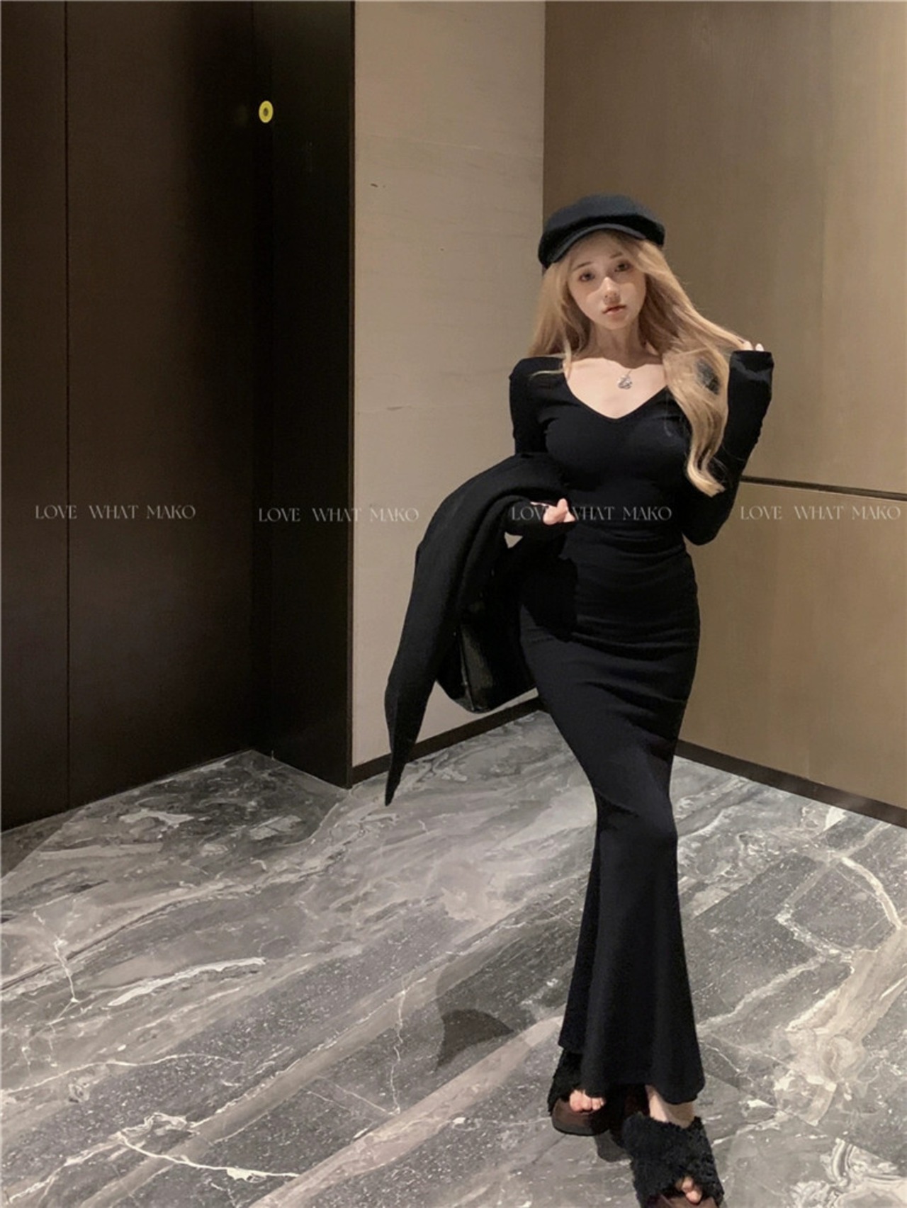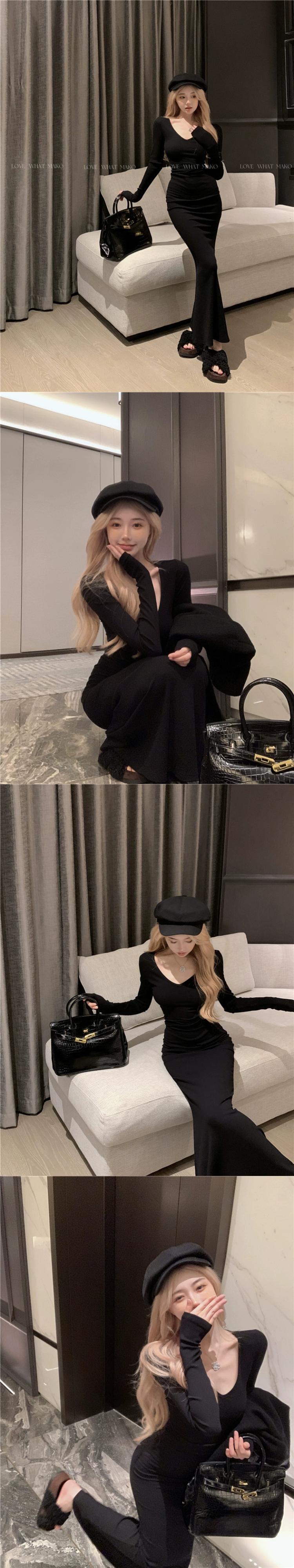 ブラック V ネックドレスレディース春スリムフィットフィッシュテールスカートタイトニットヒップハグスカートタイトなミモレ丈スカート スプリング 春物 Vネック berry79026098801 | beaute25