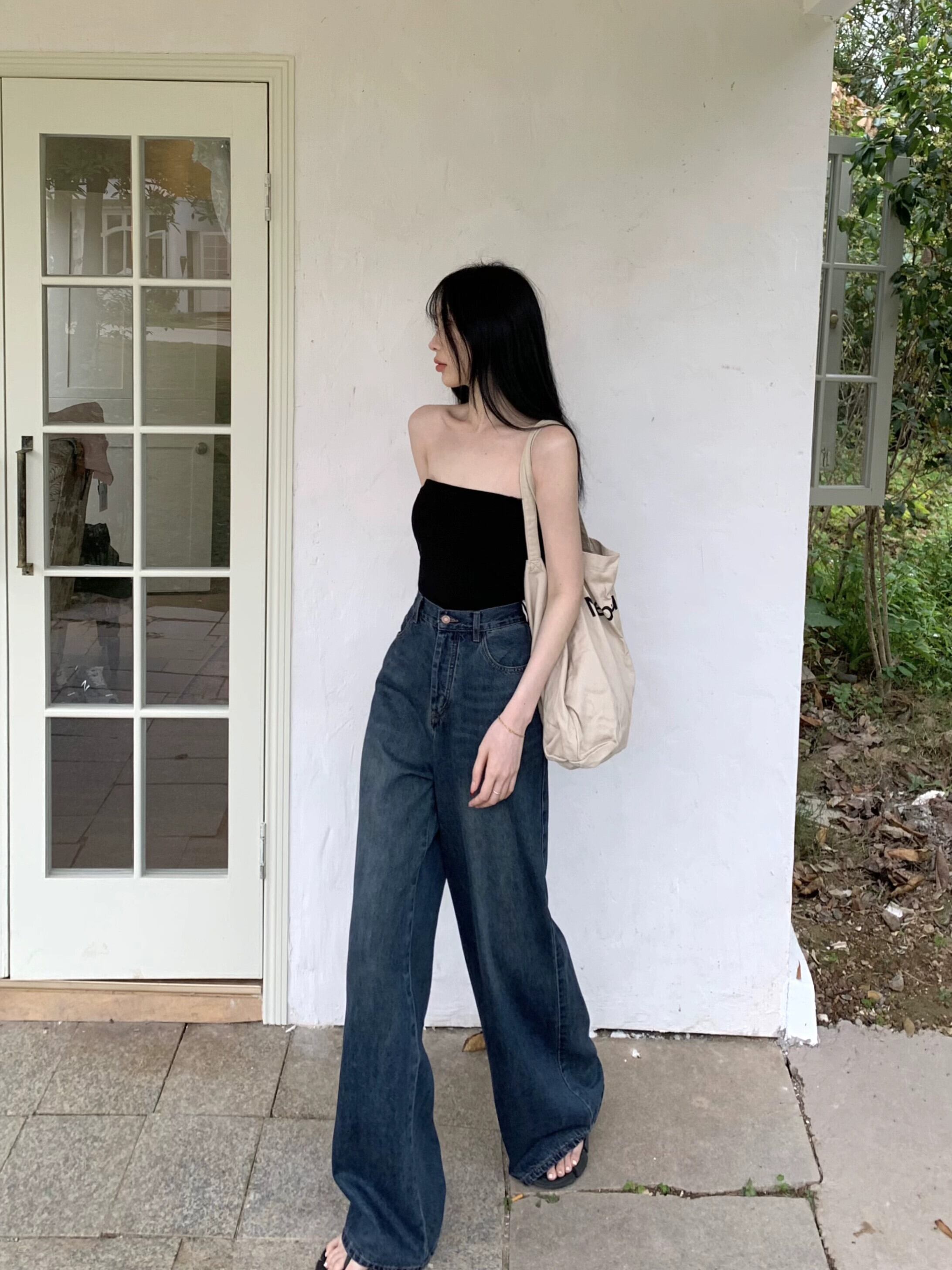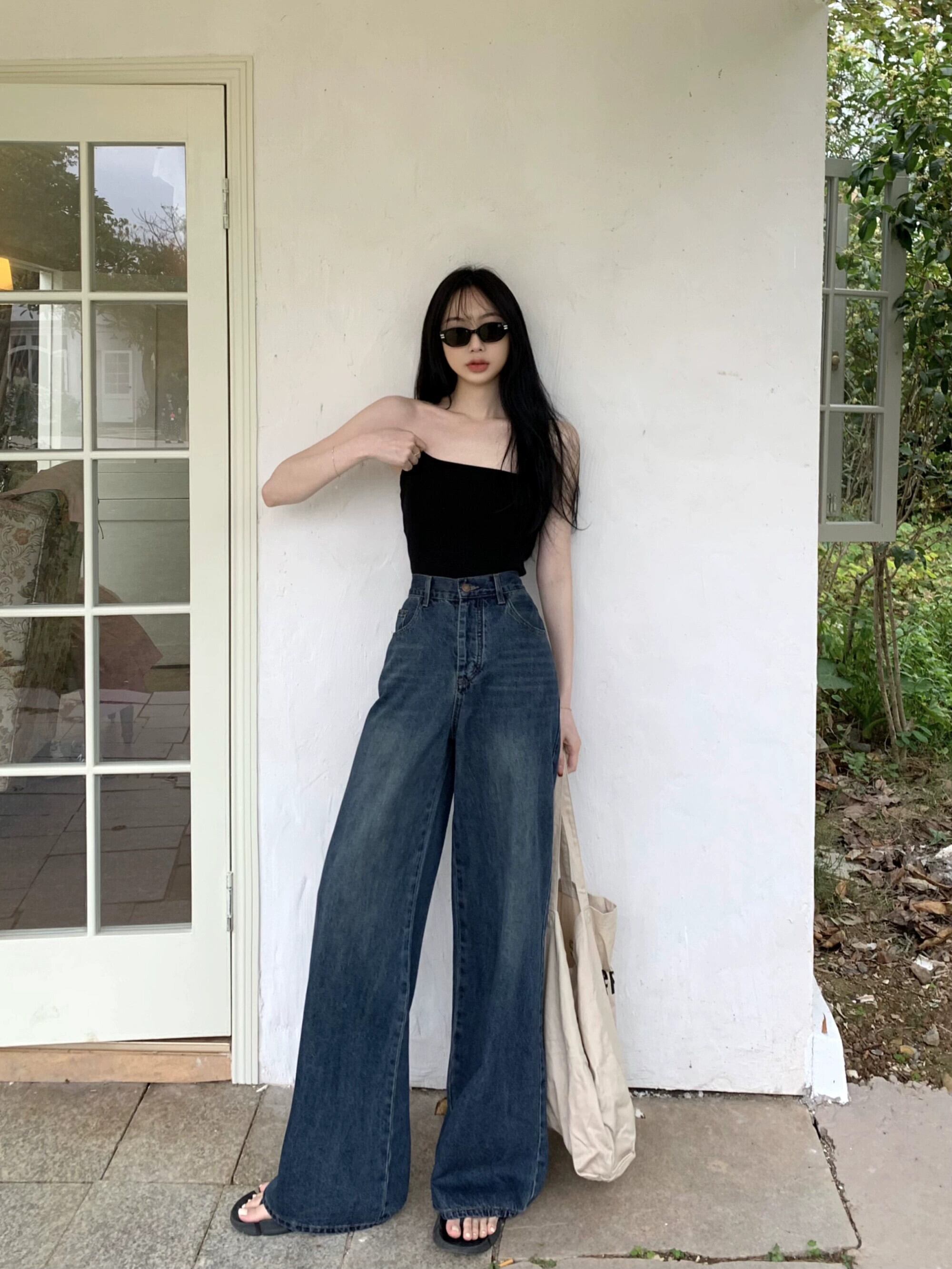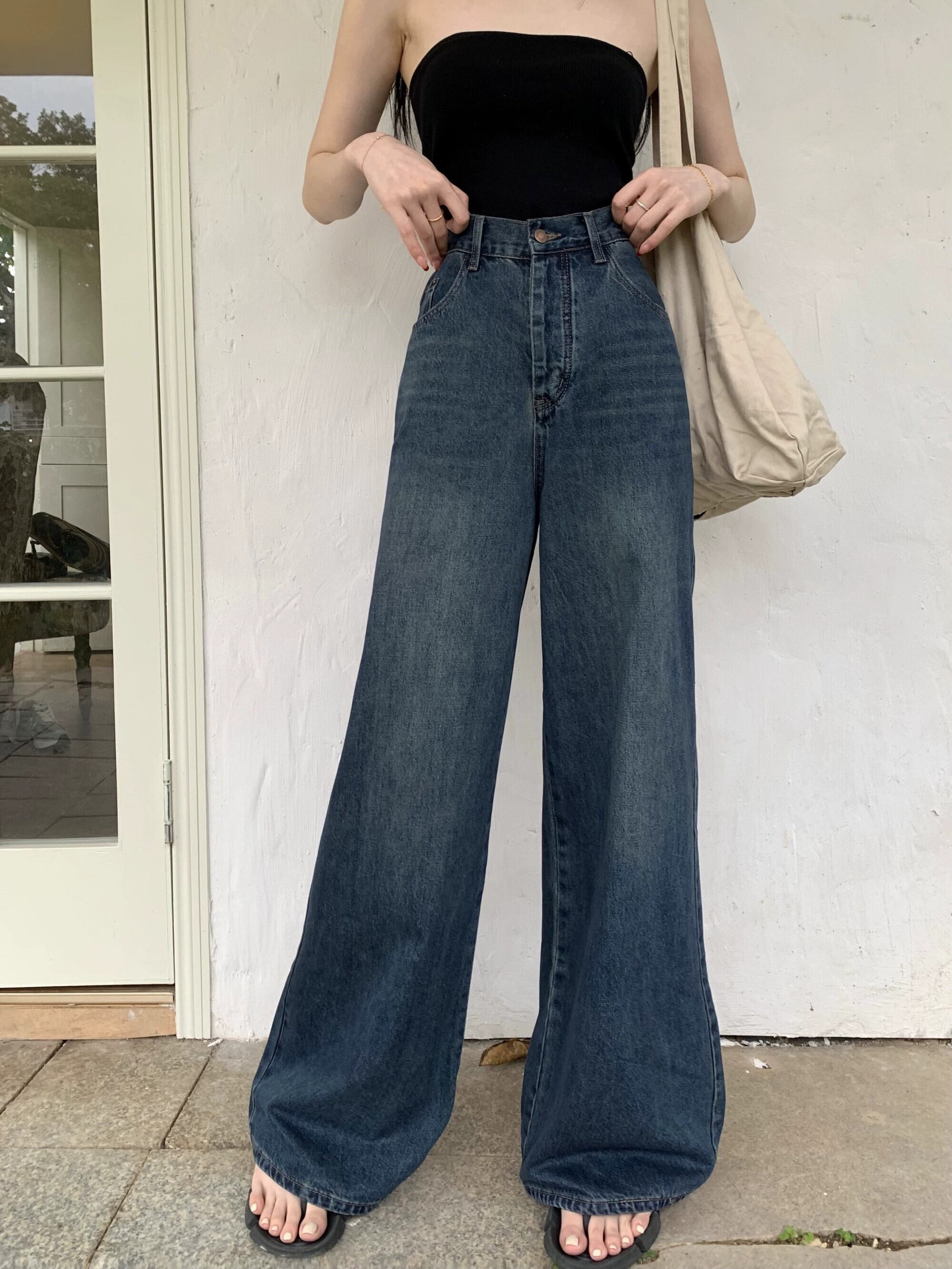 -夏用のウエストレトロストレートレッグジーンズ、アメリカンスタイルのブルーのルーズなスリムな床までの長さのズボン、多用途のワイドレッグパンツ サマー 夏物 berry58917973184