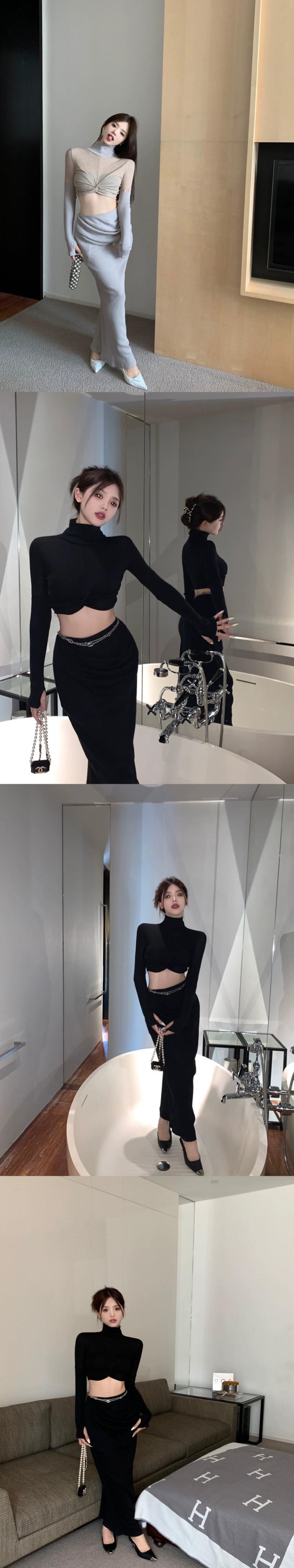 グレーハーフタートルネック長袖ニット底トップ女性春甘いホットガールウエスト露出へそセクシーなタイトなショートトップ ロング 大人ガーリー スウィート キュート カジュアル スプリング 春物 berry78517298712 | beaute25