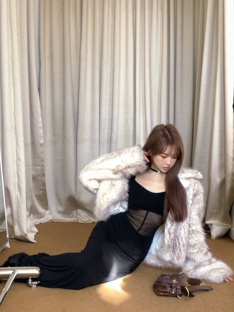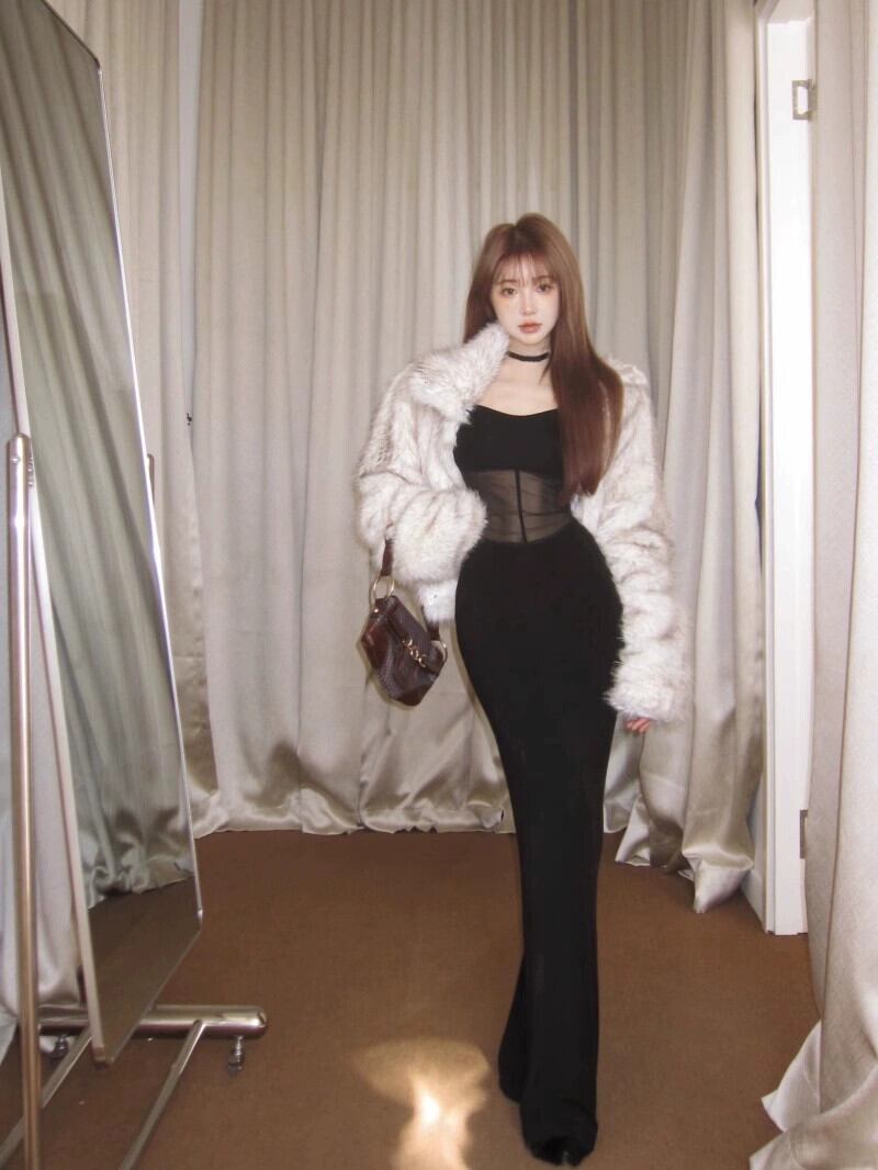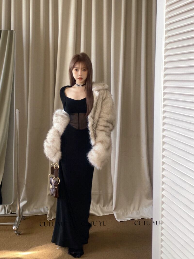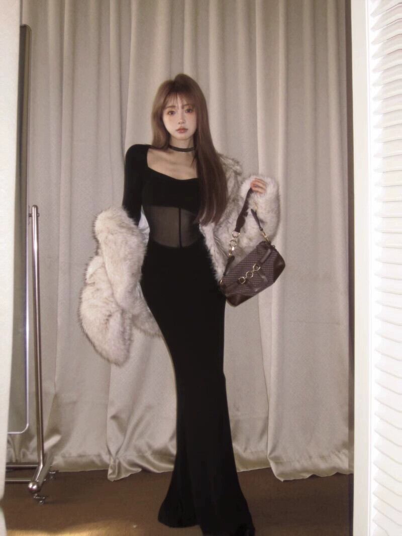 スクエアネックメッシュスプライシングドレス女性秋と冬の黒長袖インナースカート、ウエストタイトとヒップハグフィッシュテールロングスカート付き ブラック オータム 秋物 ウィンター 冬物 スクウェア berry92837971548 | beaute25