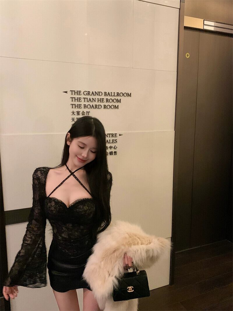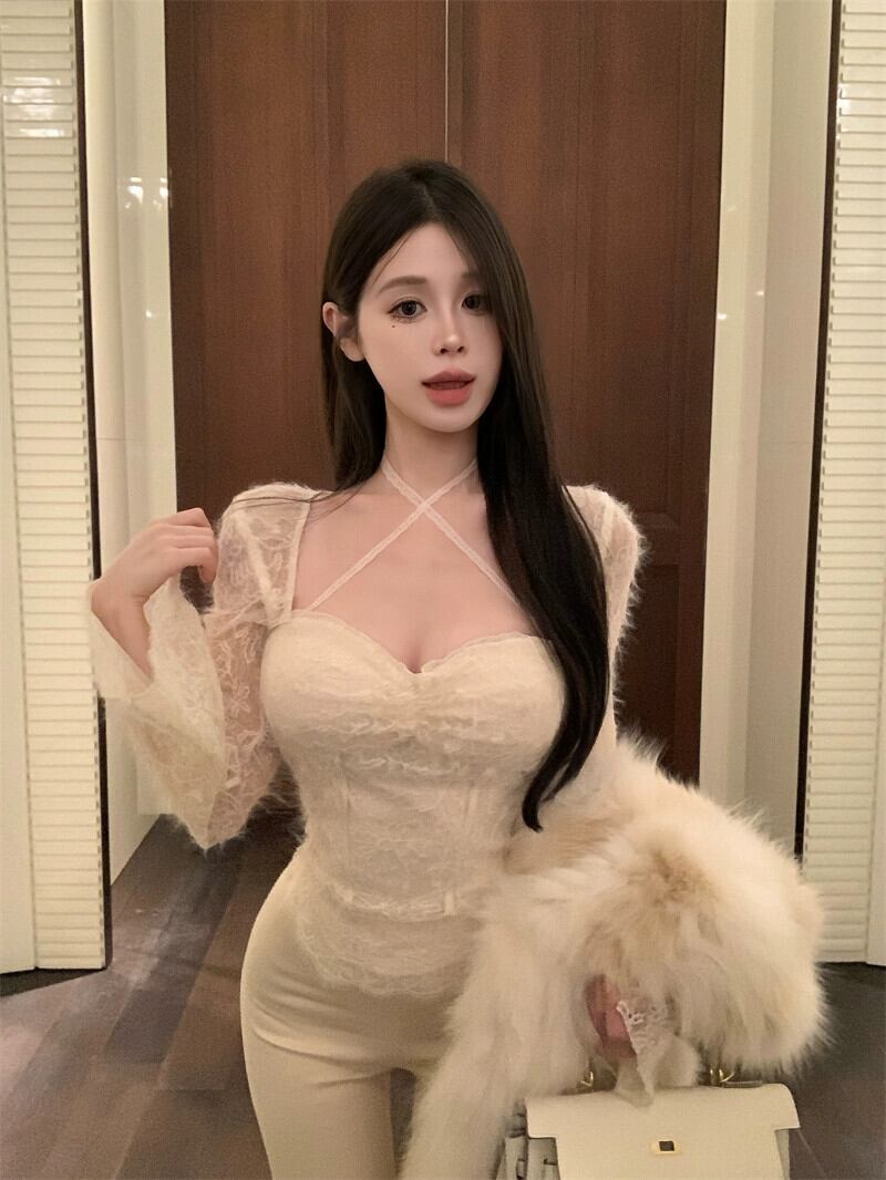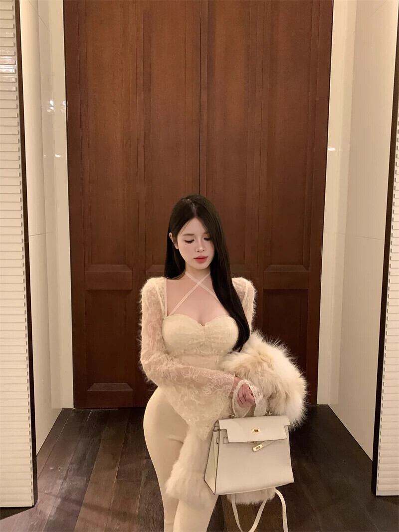 アプリコットホルターネック長袖スクエアカラーレース底シャツ女性春セクシーな純粋な欲望スタイルシックなスリムフィットインナートップ ロング スプリング 春物 ピュア スクウェア berry12077244513 | beaute25