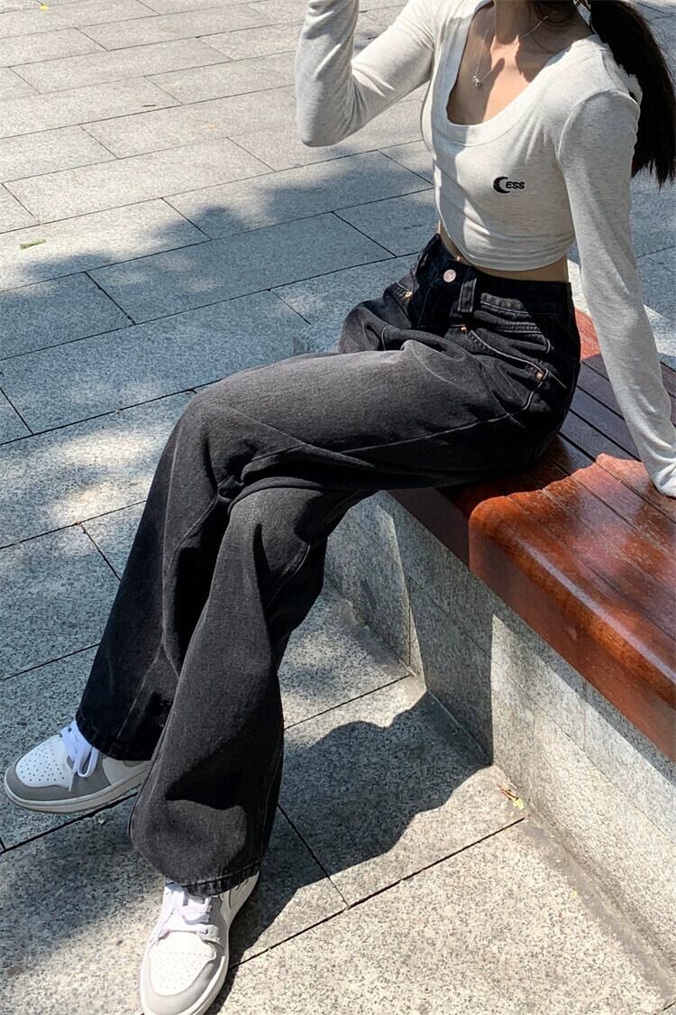 黒のハイウエスト ストレート ジーンズの女性の 2024 年春の新スタイルの小さなルーズ ワイドレッグ パンツ床モップ パンツ ハイウェスト ブラック スプリング 春物 ワイドパンツ berry14357912352 | beaute25
